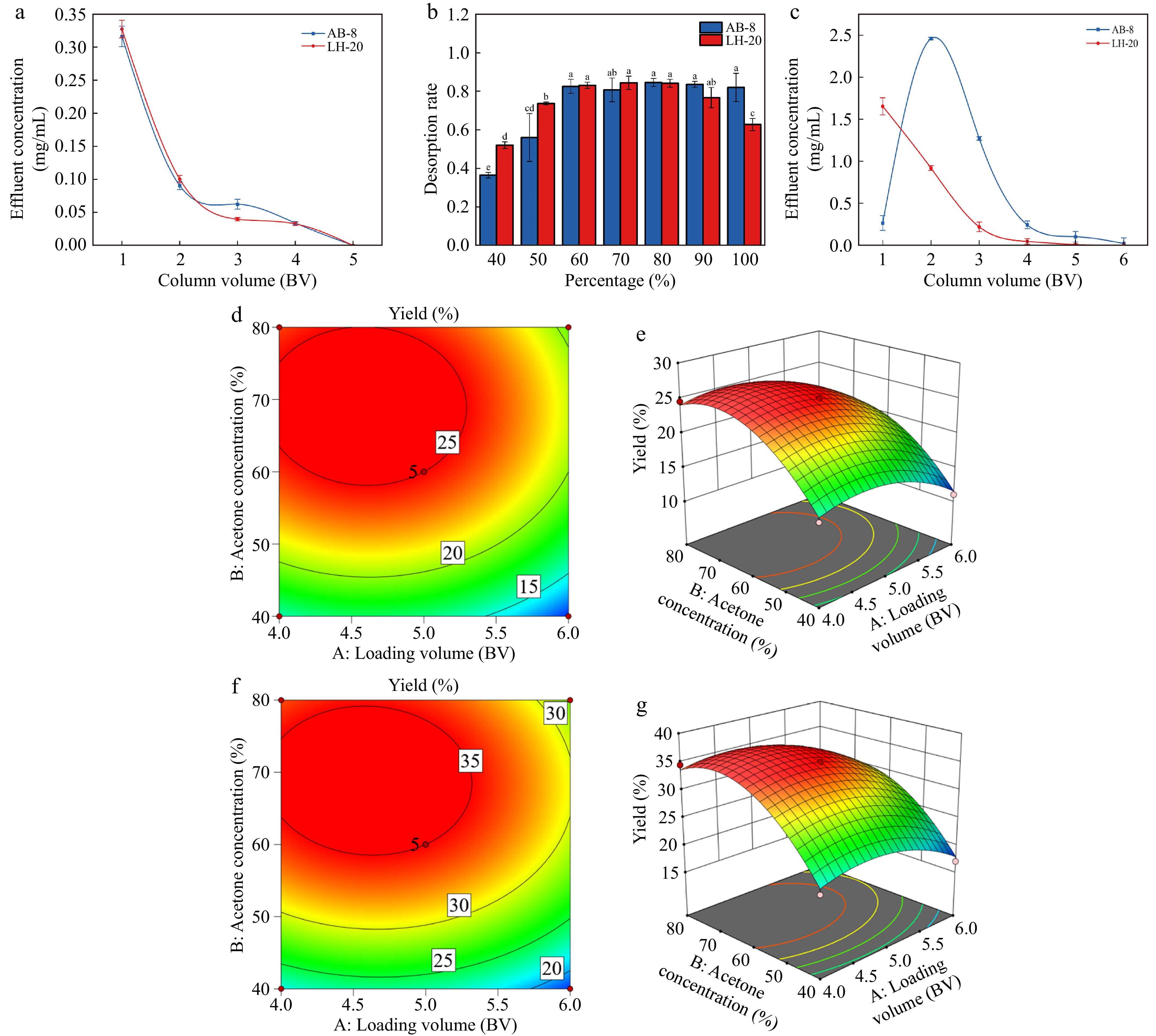 Elution parameters and response surface optimization. (a) Influence of proanthocyanidins washing volume on filtrate concentration. (b) Influence of acetone volume fraction of eluent on desorption. (c) Influence of desorption amount on filtrate concentration. (d) 2D response surface plots of macroporous resin between Loading volume (BV) and Acetone concentration (%). (e) 3D response surface plots of macroporous resin between Loading volume (BV) and Acetone concentration (%). (f) 2D response surface plots of Sephadex LH-20 between Loading volume (BV) and Acetone concentration (%). (g) 3D response surface plots of Sephadex LH-20 between Loading volume (BV) and Acetone concentration (%).