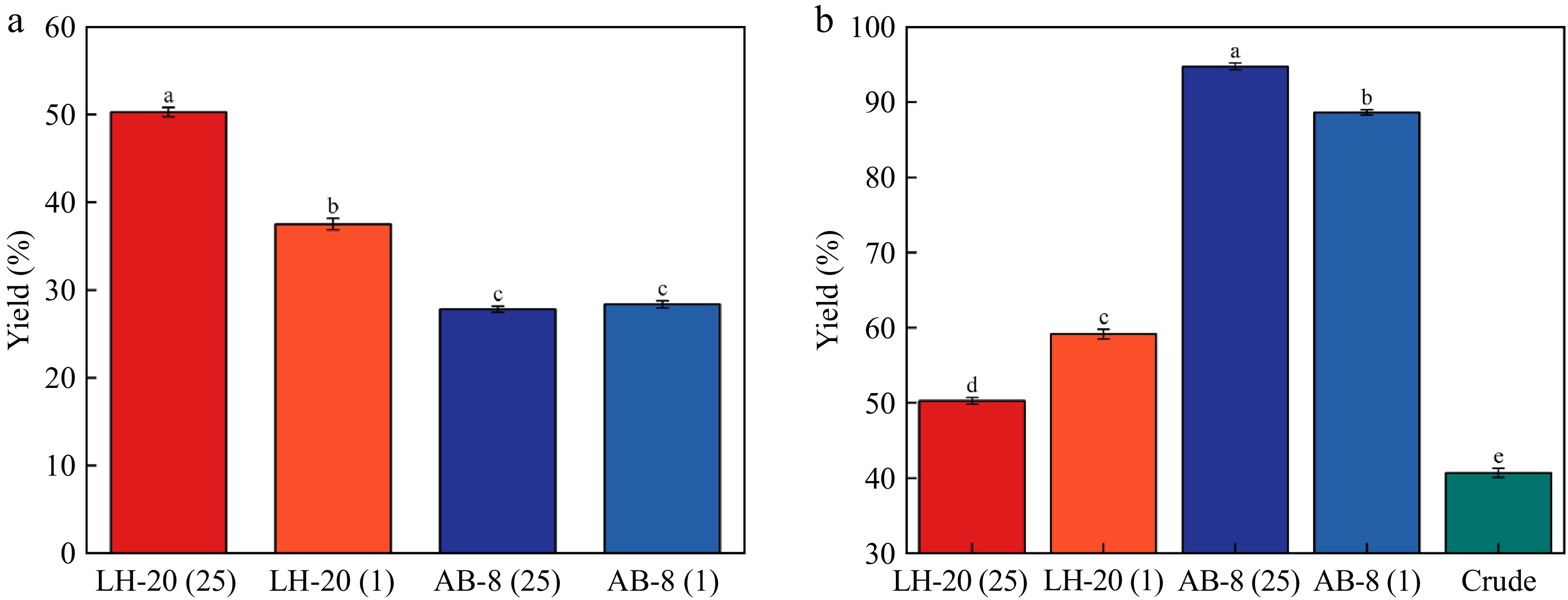 As shown in Fig. 3, the purified yield of Sephadex LH-20 with 25 mg/mL loading volume of 1 mL was the highest, reaching 53.91%; however, the purification rate is the lowest compared with the crude product. AB-8 macroporous resin with 25 mg/mL loading volume of 1 mL had the lowest yield following purification; however, the purity was up to 94%, which was similar to the results of previous studies using macroporous resin purification[48]. Overall, the purity of macroporous resin purification is better than that of Sephadex LH-20. Although Sephadex LH-20 has the advantages of smooth and stable sample loading, high yield, and high absorption rate during sample loading, AB-8 macroporous resin is more suitable for PAs purification because the purity of PAs obtained from macroporous resin is much higher than that of Sephadex LH-20 purification.