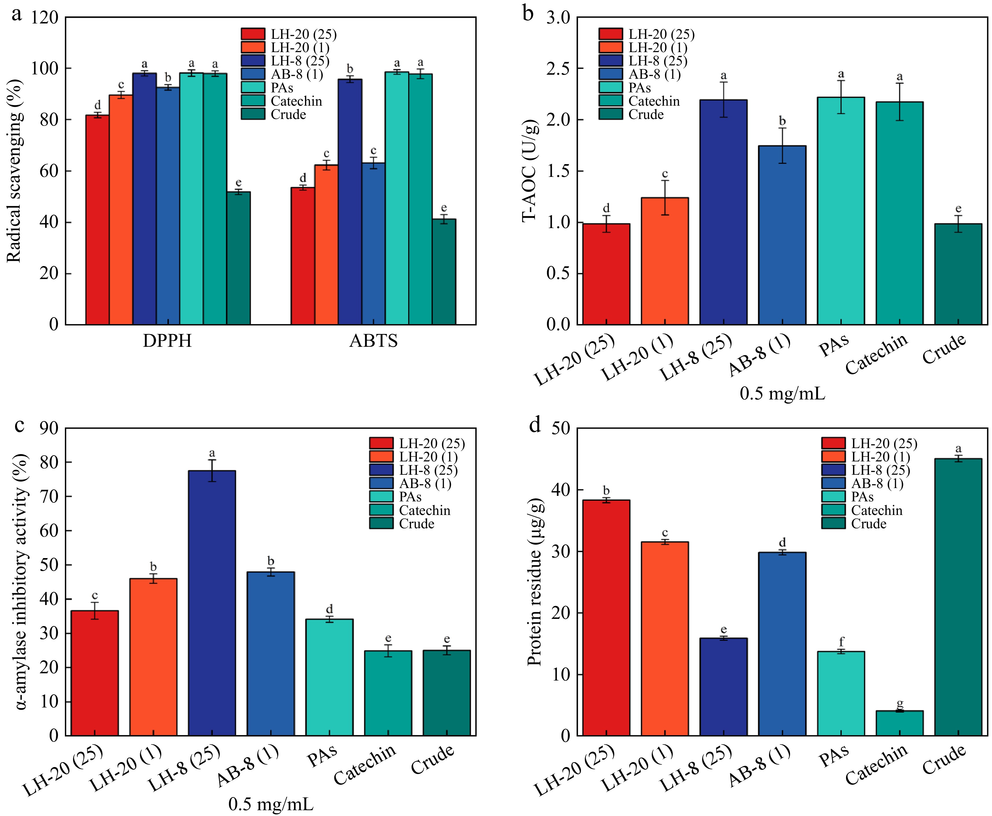 The α-amylase inhibitory activity of AB-8 (25) was the strongest, the α-amylase inhibitory activity of 0.5 mg/mL could reach 80%, and the α-amylase inhibitory activity of crude PAs could only reach 25%. The inhibitory activity of PAs on α-amylase is shown in Fig. 4c. When the mass concentration of PAs was 0.5 mg/mL, the crude product showed an inhibitory activity on α-amylase (inhibitory rate, 25%). In contrast, PAs purified by macroporous resin showed a higher activity against α-amylase. The inhibitory activity of PAs purified by Sephadex LH-20 on α-amylase was slightly lower than that purified by resin, which was one-half that of resin. Therefore, macroporous resin is an essential part of the PAs purification. Compared with previous studies[50], the inhibitory rate of amylase was low, which may be related to the low purity of the pure product following Sephadex LH-20 purification. Protein residues are shown in Fig. 4d. Samples with high purity have fewer protein residues.