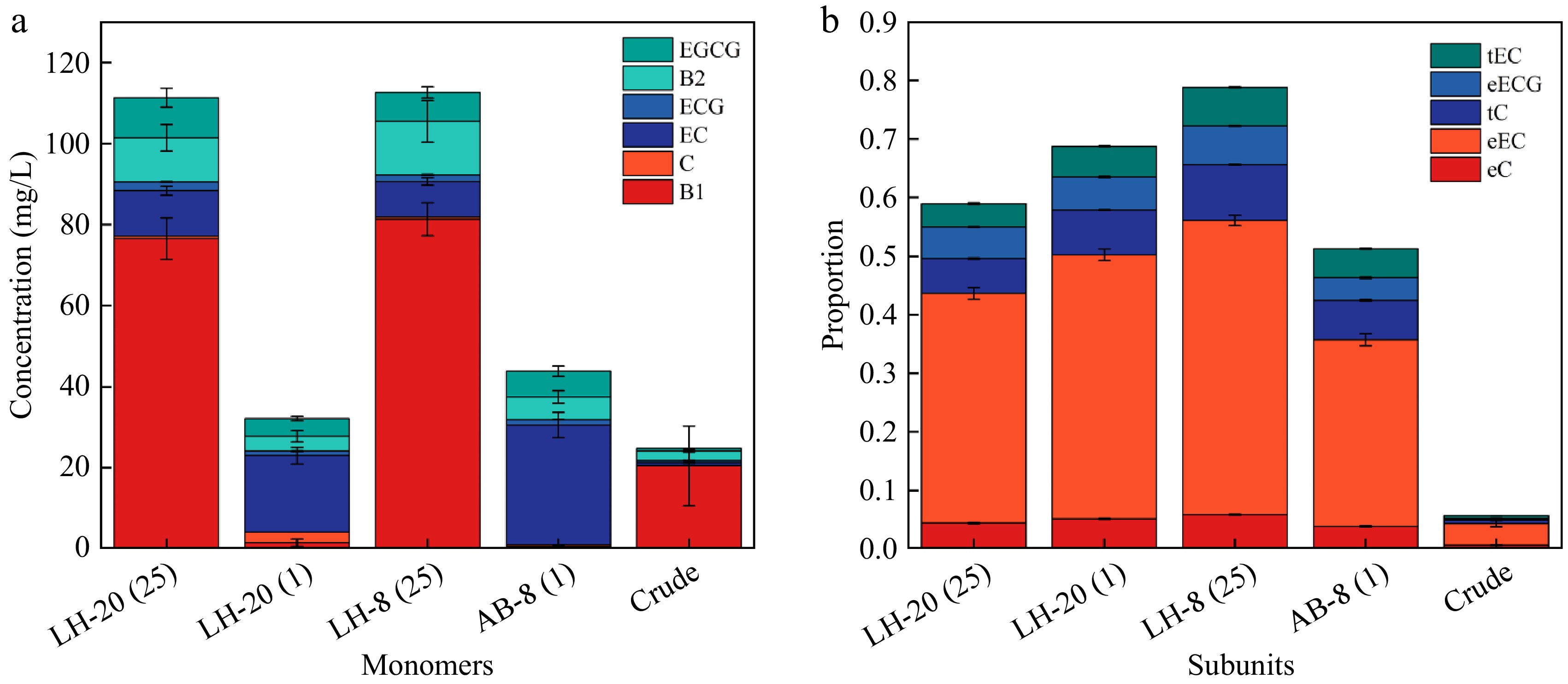 As shown in Fig. 5 and Table 3, the average polymerization degree of the product obtained after Sephadex LH-20 is significantly higher than that of the product obtained after macroporous resin, and the loading concentration was 25 mg/mL of macroporous resin and Sephadex LH-20 had a significantly higher polymerization degree than loading concentration was 1 mg/mL of macroporous resin and Sephadex LH-20. The total molar concentration of 25 mg/mL macroporous resin was significantly higher than that of the other purification methods. The mDP of the crude product did not change significantly after purification, but the total monomer concentration increased. An Agilent 1260 Infinity II series HPLC system has identified the following five kinds of PAs monomer and dimer: tC, eC, eEC, eECG, and tEC. No tECG and eEGC were detected, e is extension units, t is terminal units. PAs purified by Sephadex LH-20 had a generally higher degree of polymerization than PAs purified by macroporous resin. LH-20 (25) has the highest G%. This finding may be related to the polarity of the different fillers. In the case of the same quality of PAs crude sample, the higher the concentration of PAs crude solution, the smaller the volume, resulting in higher monomer concentration and higher content of B1. The loading concentration directly affected the monomer concentration.