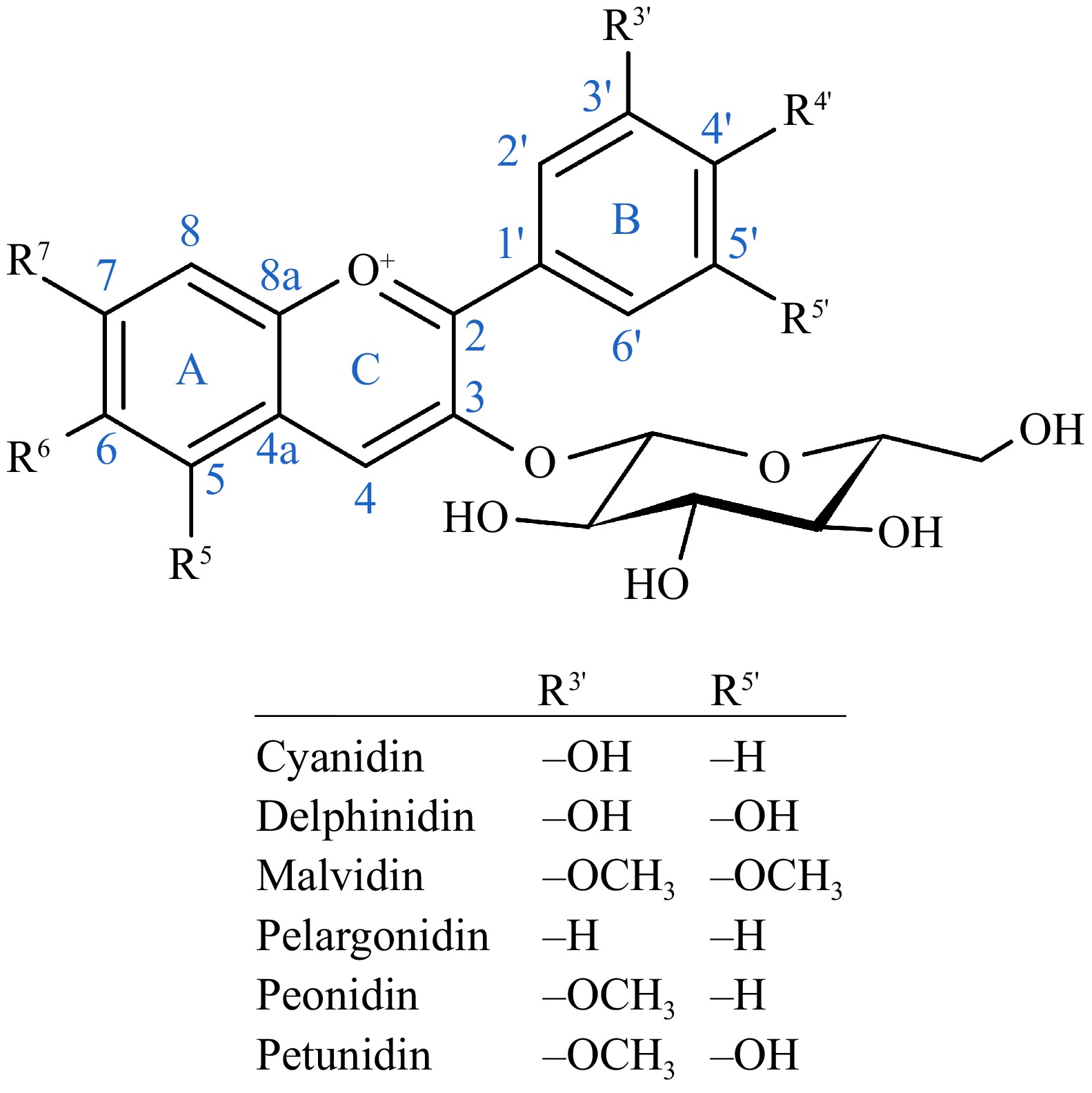 General structure of an anthocyanin with a glycosyl group at position 3[45], and the functional groups of the six most common anthoyanidins at positions 3′ and 5′.