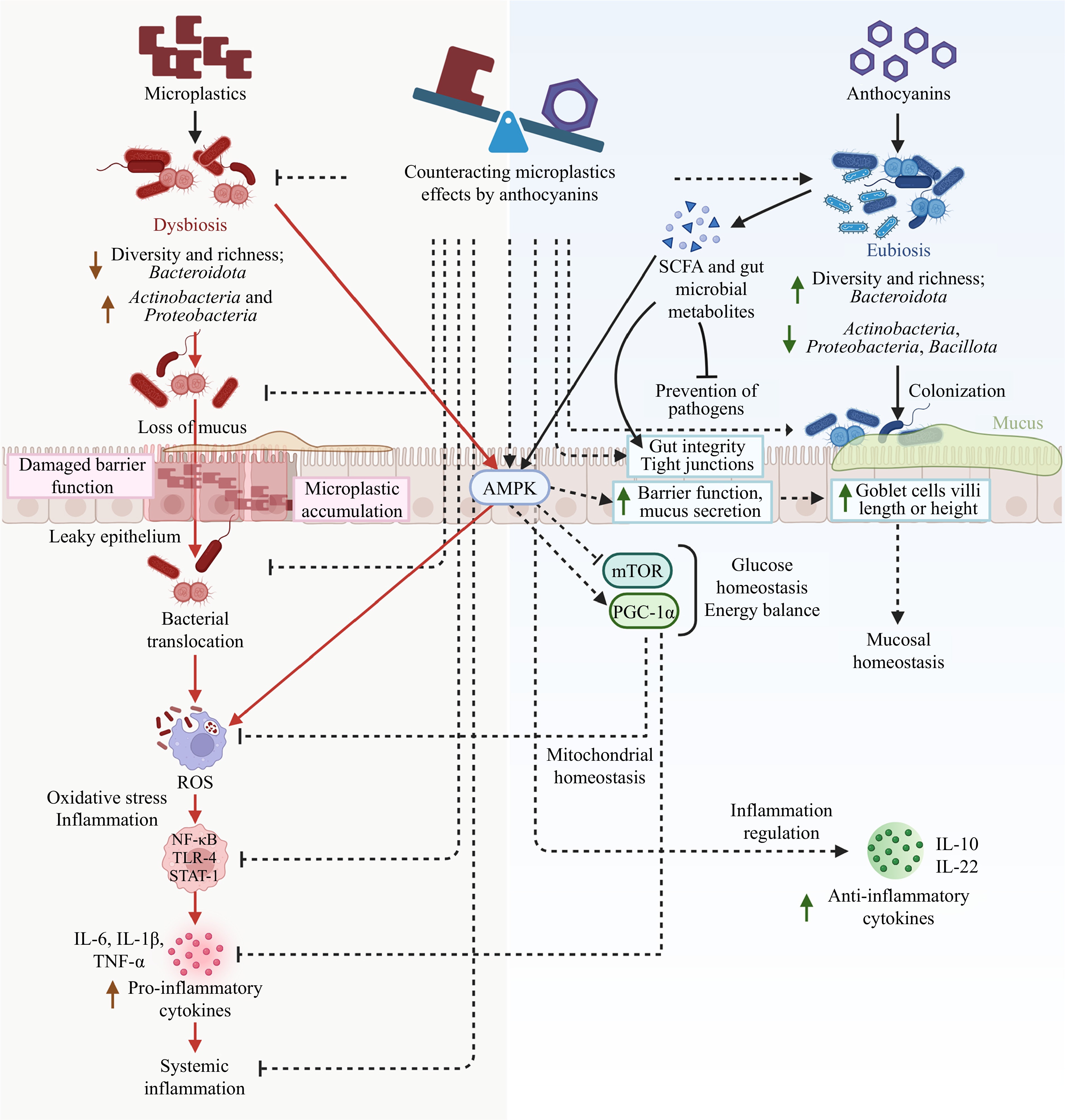 Impact of microplastics on gut microbiota and the known and proposed (dashed lines) mechanisms of action of anthocyanins in counteracting dysbiosis.