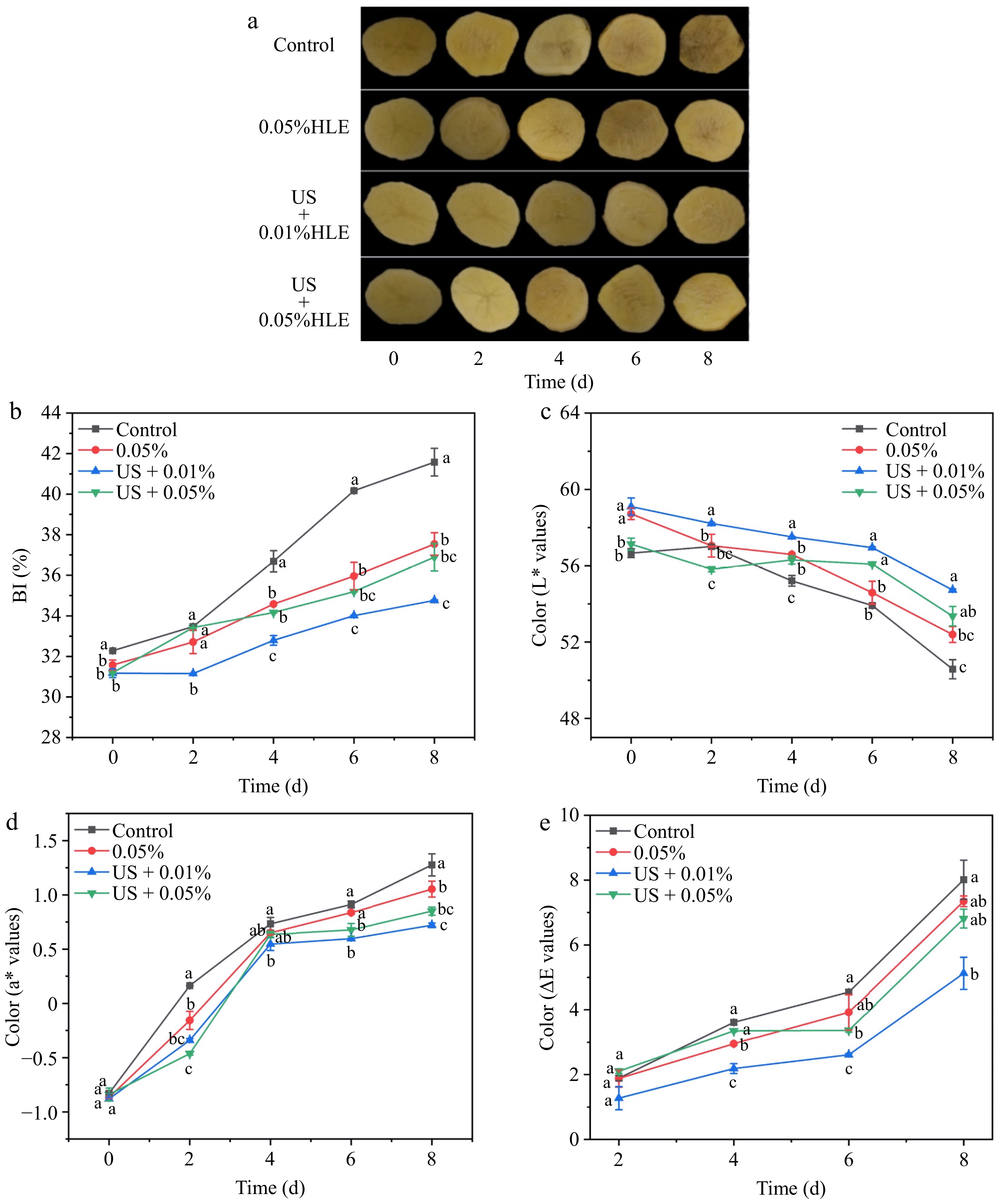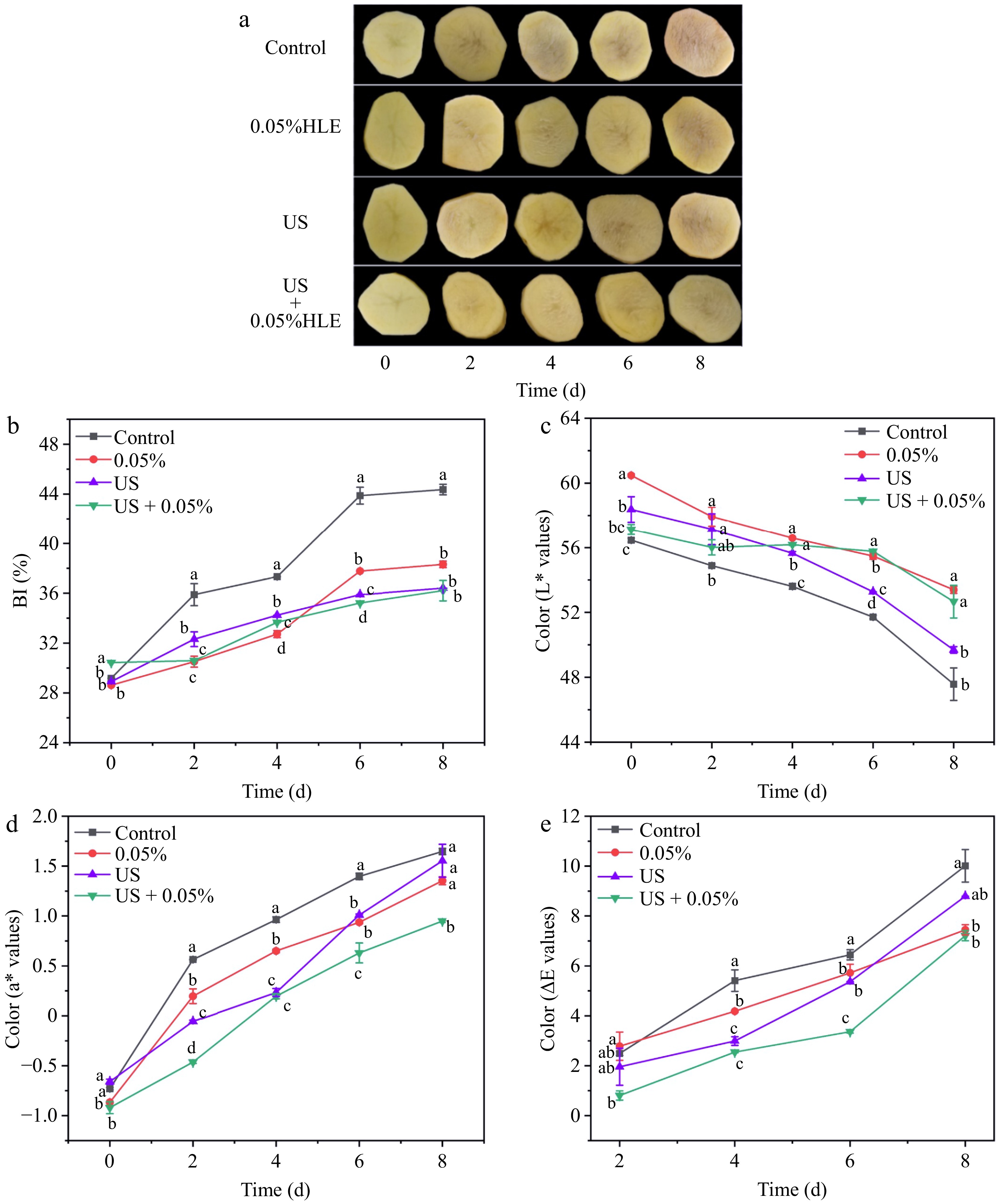 (a) Effect of different treatments (Control: distilled water, HLE: hawthorn leaf extract, US: ultrasound, US + 0.05% HLE: the combination of ultrasound and hawthorn leaf) on appearance, (b) BI value, (c) L* value, (d) a* value, and (e) ΔE* of fresh-cut potato during storage at 4 °C for 8 d. Data are express as the mean ± standard error (n = 3). Different letters indicate significant differences between groups (p < 0.05).