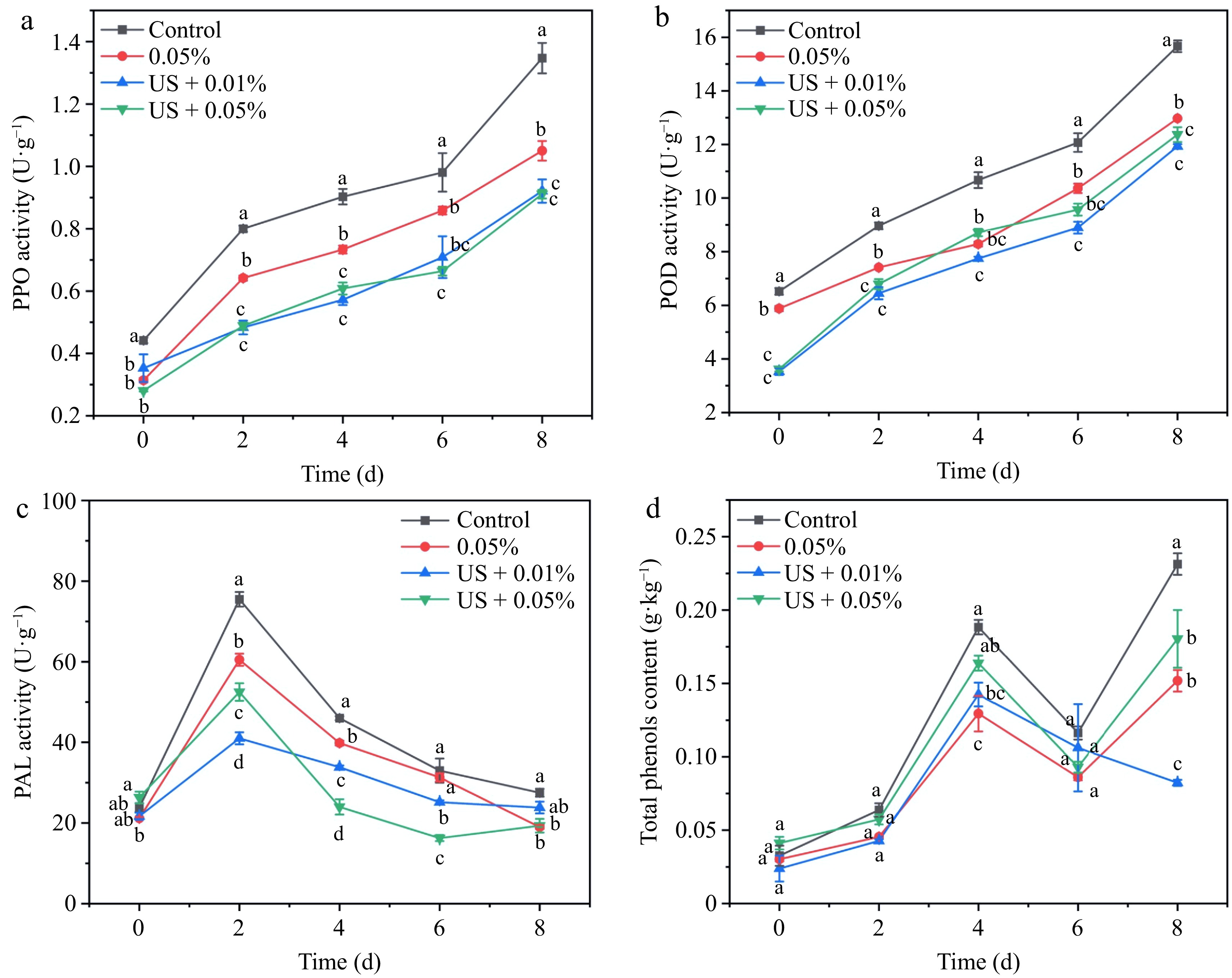 • There is sufficient evidence that browning development is highly correlated with the activity of PPO, POD, PAL, and phenol content[16,25,29]. PPO is a representative enzyme that accelerates the oxidation of polyphenols to quinones and polymerizes them to produce melanin precipitation[16]. In Fig. 3a, US + 0.01% HLE, and US + 0.05% HLE treatment produced similar trends of PPO activity, which were the lowest level during storage. POD accelerates the oxidation of phenols by H2O2 to form quinones, which then polymerize to darker colored products[29]. Similar to PPO, POD in ultrasound combination groups maintained a lower level, regardless of the concentration (Fig. 3b). PAL, a major and rate-limiting enzyme in phenol metabolism, can induce the gathering of phenolic substrates and thus affect the enzymatic browning reactions[17]. The combination treatment consistently maintained lower PAL activity from day 2 to day 6 in Fig. 3c. And 0.05% HLE alone or combined with US significantly retarded PAL on the last day. Figure 3d revealed that the US + 0.01% HLE treatment significantly reduced the accumulation of phenols. On day 8, the total phenol content of US + 0.01% HLE were only 34.89% and 45.61% of the control group, and US + 0.05% HLE, respectively.