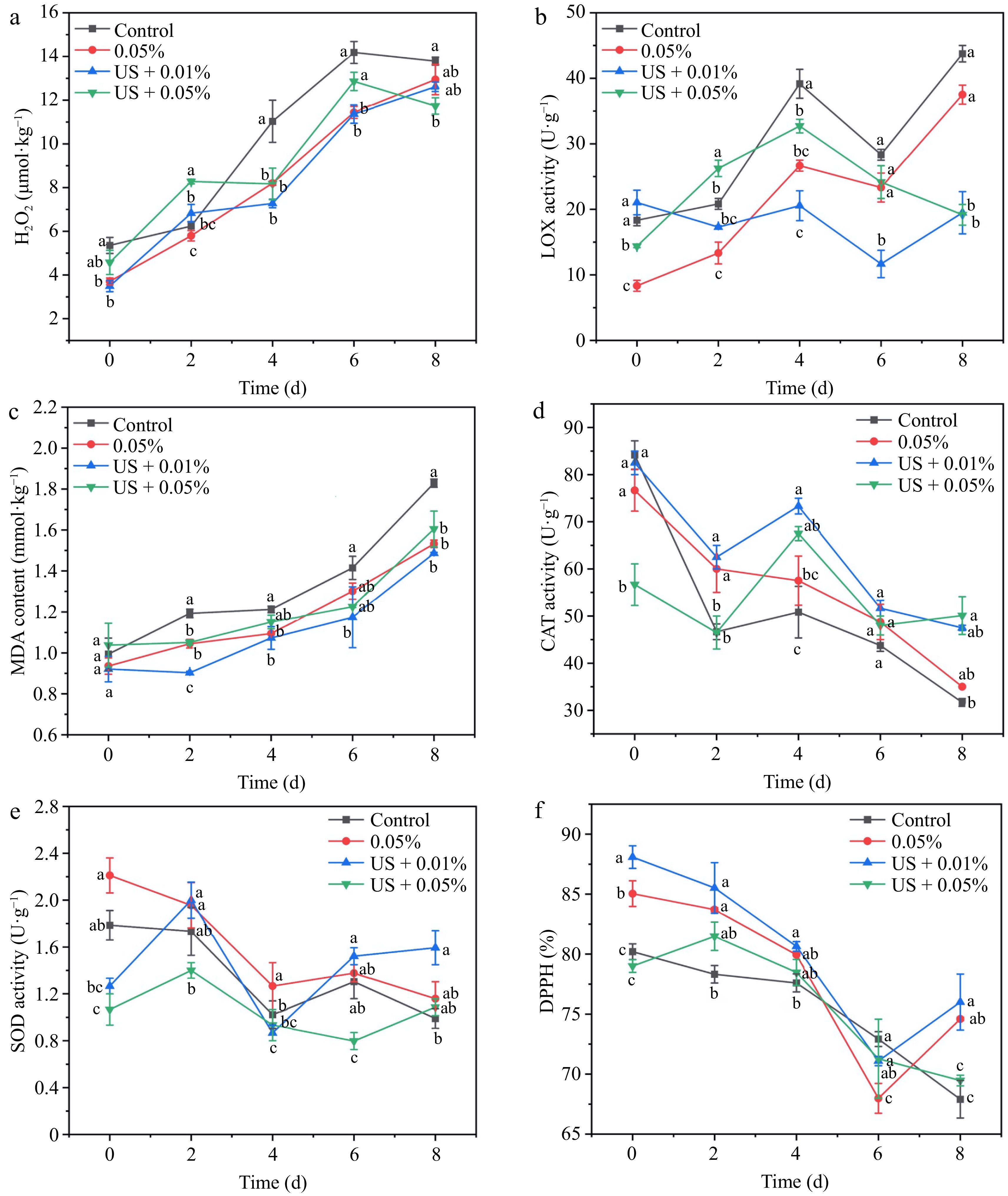 • Excessive reactive oxygen not only affects the antioxidant activity of food and biological systems, but also results in the formation of unsaturated fatty acids in phospholipids, lipid peroxidation, and the destruction of biofilm[29]. Among these treatments, the US + 0.01%HLE treatment maintained a lower H2O2 content during storage (Fig. 5a). Especially on day 4, the H2O2 content was only 65.91% of the control group and 88.59% of US + 0.05%HLE. LOX can be used as a specific and reliable indicator to reflect lipid peroxidation reaction, and its activity is related to plant senescence[33]. Figure 5b demonstrated LOX activity was observably suppressed by external treatments from day 4 to day 8, especially by US + 0.01% HLE treatment, which consistently maintained the lowest activity. MDA, as an indicator of lipid peroxidation, was usually used to denote membrane integrity[34]. In Fig. 5c, MDA accumulated with time, which was similar to that of H2O2 (Fig. 5a). Among four groups, US + 0.01% HLE treatment produced the lowest MDA content, while the control group produced the most.