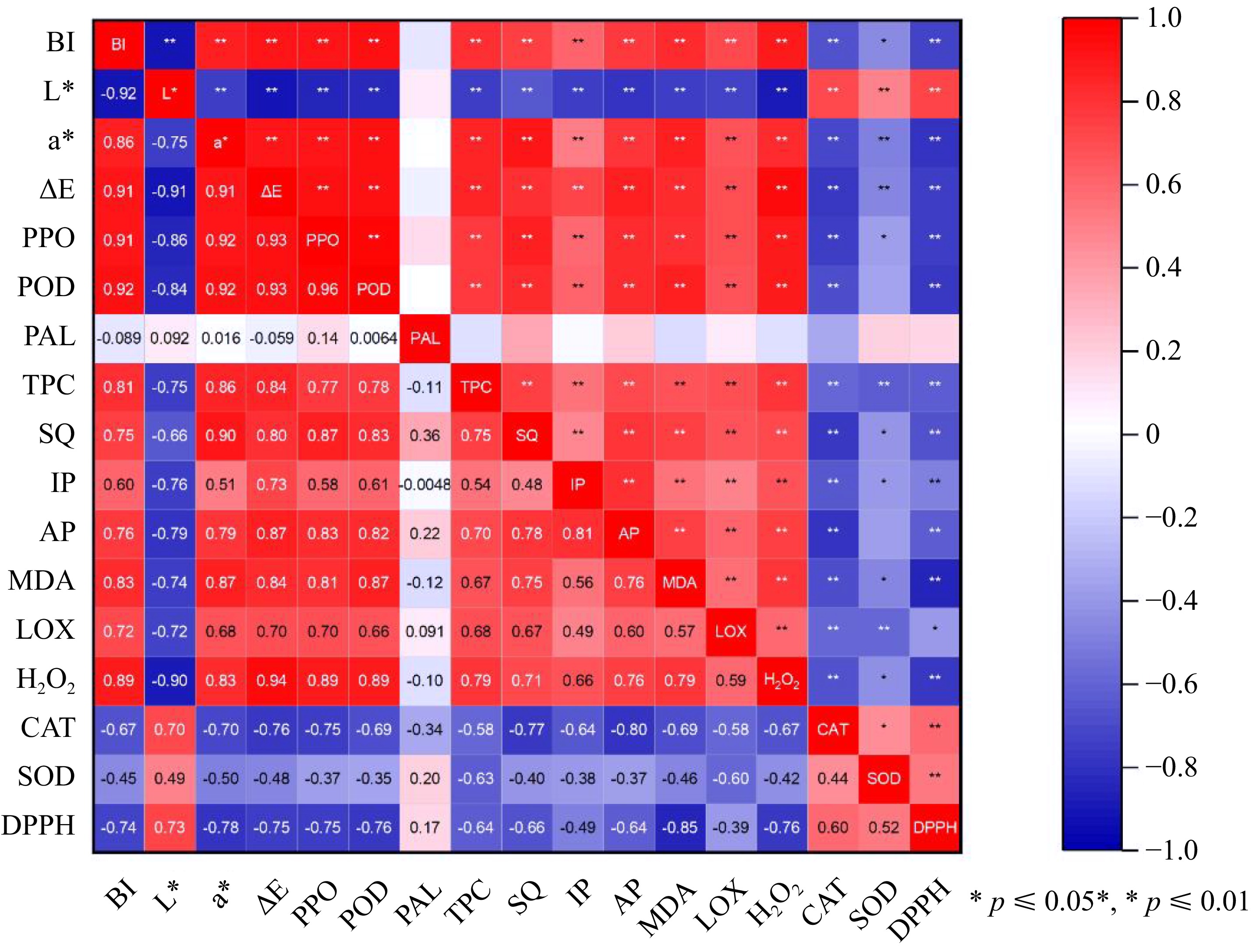 Pearson correlation matrix of browning index (BI), color (L*, a*, ΔE*), enzymes (PAL, PPO, POD), total phenol content (TPC), browning products (soluble quinone (SQ), intermediate product (IP), advanced product (AP)), related membrane peroxides (LOX, MDA, H2O2), antioxidant enzymes (CAT, SOD), and antioxidant activity (DPPH). Different asterisks indicate different levels of significance (* p ≤ 0.05; ** p ≤ 0.01).