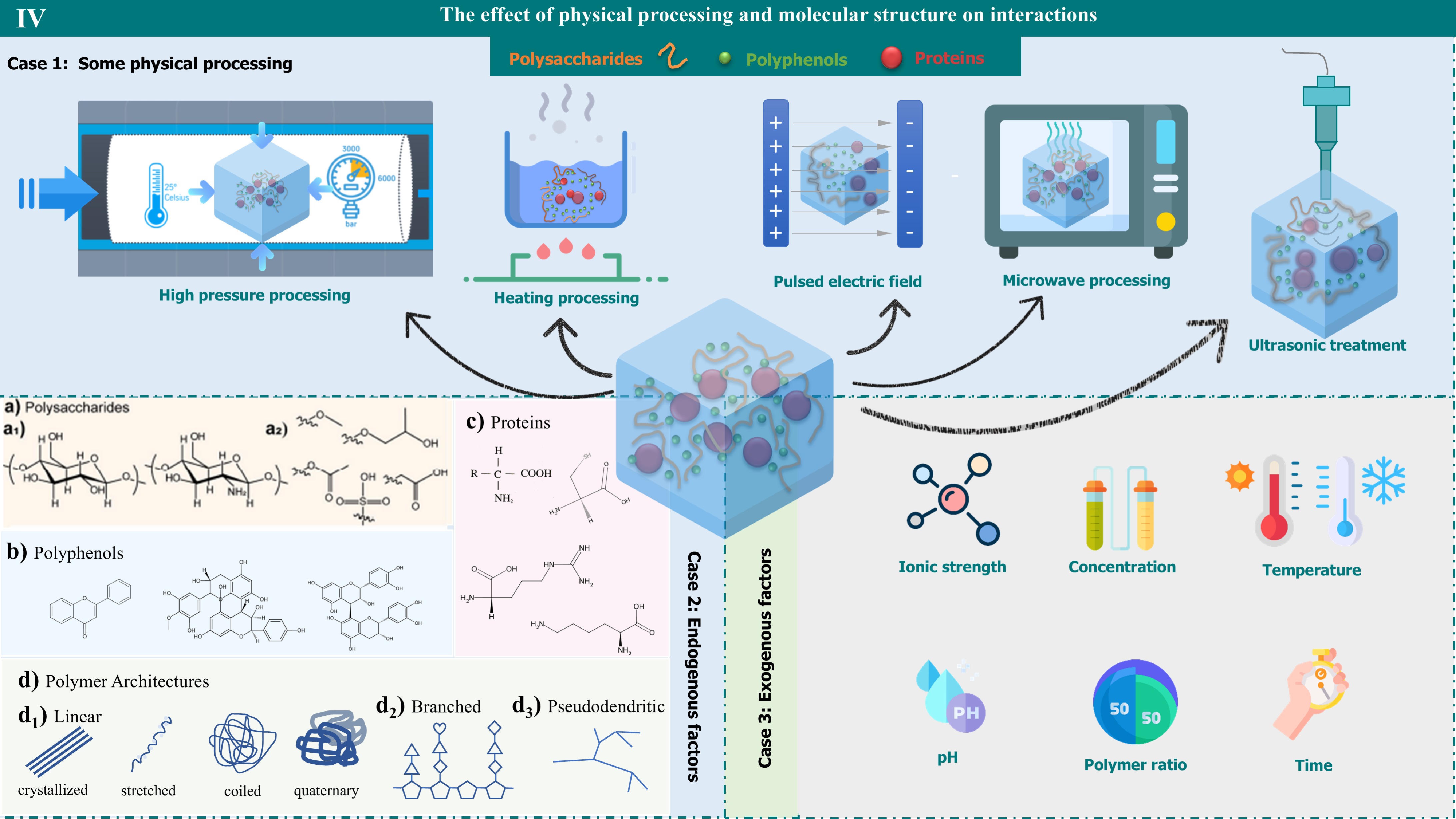 The effect of physical processing and molecular structure on interactions. It reveals how the physical treatment steps and molecular structure affect the interactions. A variety of physical treatment techniques, including high-pressure, heating, pulsed-electric fields, microwaves, and ultrasound, are demonstrated. In addition, the role of molecular structure in interactions can be divided into two main categories: endogenous and exogenous. Endogenous factors involve the structural properties of polysaccharides, polyphenols, proteins, and polymer architectures, while exogenous factors include the effects of ionic strength, concentration, temperature, pH, polymer ratio, and time.