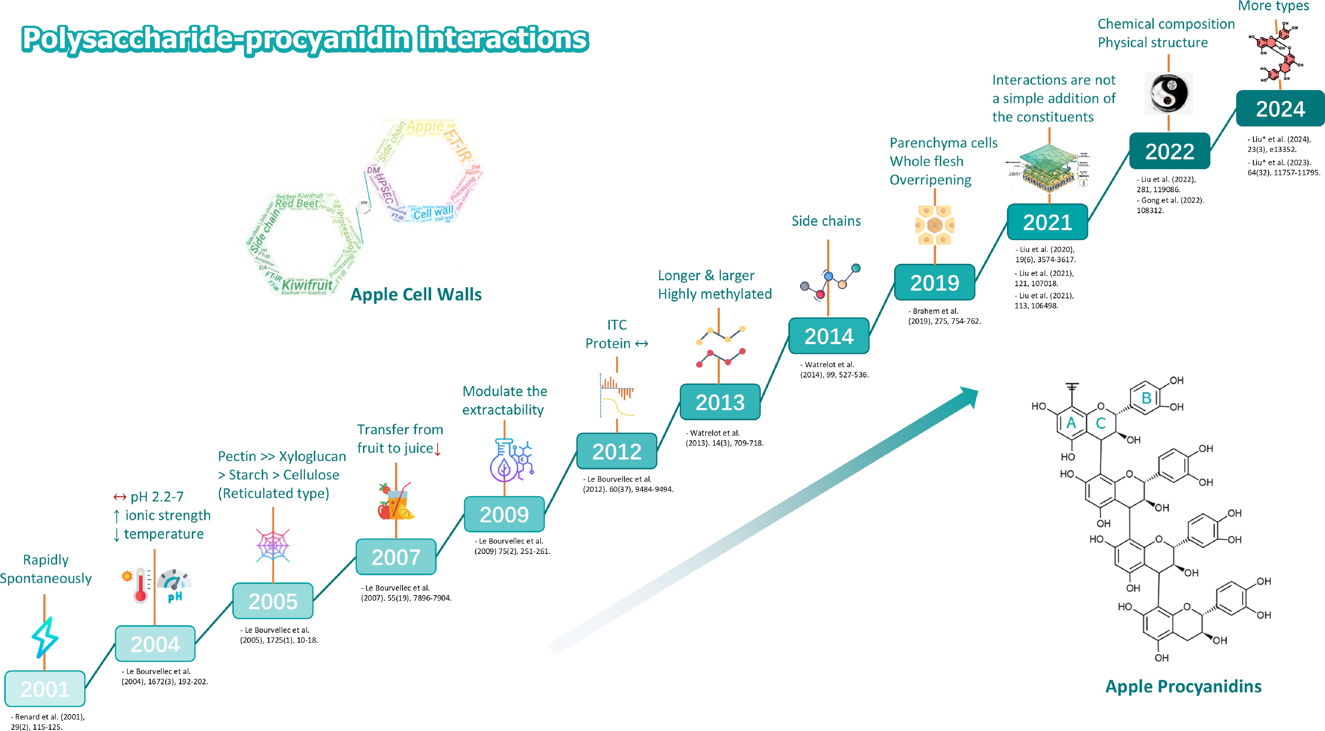 Weak interactions between plant intracellular polyphenols and cell walls have long been recognized by practitioners, but until the late 1990s, it was difficult to analyze procyanidins and quantify the phenomena. This was also due to the low affinity of cell wall-polyphenol complexes, making them difficult to quantify. However, with the arrival of new analytical methods and adequate models, it became possible to advance in this area. Research on the interaction between apple cell walls and procyanidins has seen significant advancements from 2001 to 2024 (Fig. 5). In the seminal study by Renard et al.[51], it was observed that apple procyanidins spontaneously and immediately attach to cell wall material (CWM) derived from apples. Procyanidins were found to bind weakly but rapidly to cell walls, with a higher binding affinity observed at higher molecular weights. Subsequent studies, in particular, the work of Le Bourvellec et al.[13] and Le Bourvellec et al.[188], showed that pH and ionic strength affect their non-covalent interactions and polysaccharide extraction yields. The assembly of complexes involving procyanidins and CWM remained unchanged across a pH spectrum from 2.2 to 7[13]. The adsorption rate rose in correlation with higher ionic strength and fell as the temperature rose. The procyanidins mainly bind to pectins, restricting their depolymerization[188]. Furtherstudies by Le Bourvellec et al.[57], Watrelot et al.[190], Watrelot et al.[191], and Brahem et al.[192] have detailed the specific binding affinities and mechanisms of the different polysaccharides, as well as the effects of fruit maturity and tissue type. Le Bourvellec et al.[58] studied the adsorption of procyanidins on solid polysaccharides, taking into account the effects of polymerization and galloylation degrees. The binding affinity of polysaccharides is ranked as follows: pectin >> xyloglucan > starch > cellulose. Watrelot et al.[190] and Watrelot et al.[191] conducted research on interactions between procyanidin and specific pectin substructures, revealing that DP30 tannins have a greater affinity for highly methylated pectin compared to DP9. They also found that the binding to pectin's hairy regions is influenced by sugar side chains, with DP30 binding more strongly, aggregating more; this is correlated with the content of arabinan and galacturonic acid[191]. Brahem et al.[192] demonstrated that maturity and tissue type of pear pulp affect procyanidin-cell wall interactions, with higher adsorption of highly polymerized procyanidins by overripe pulp cell walls.