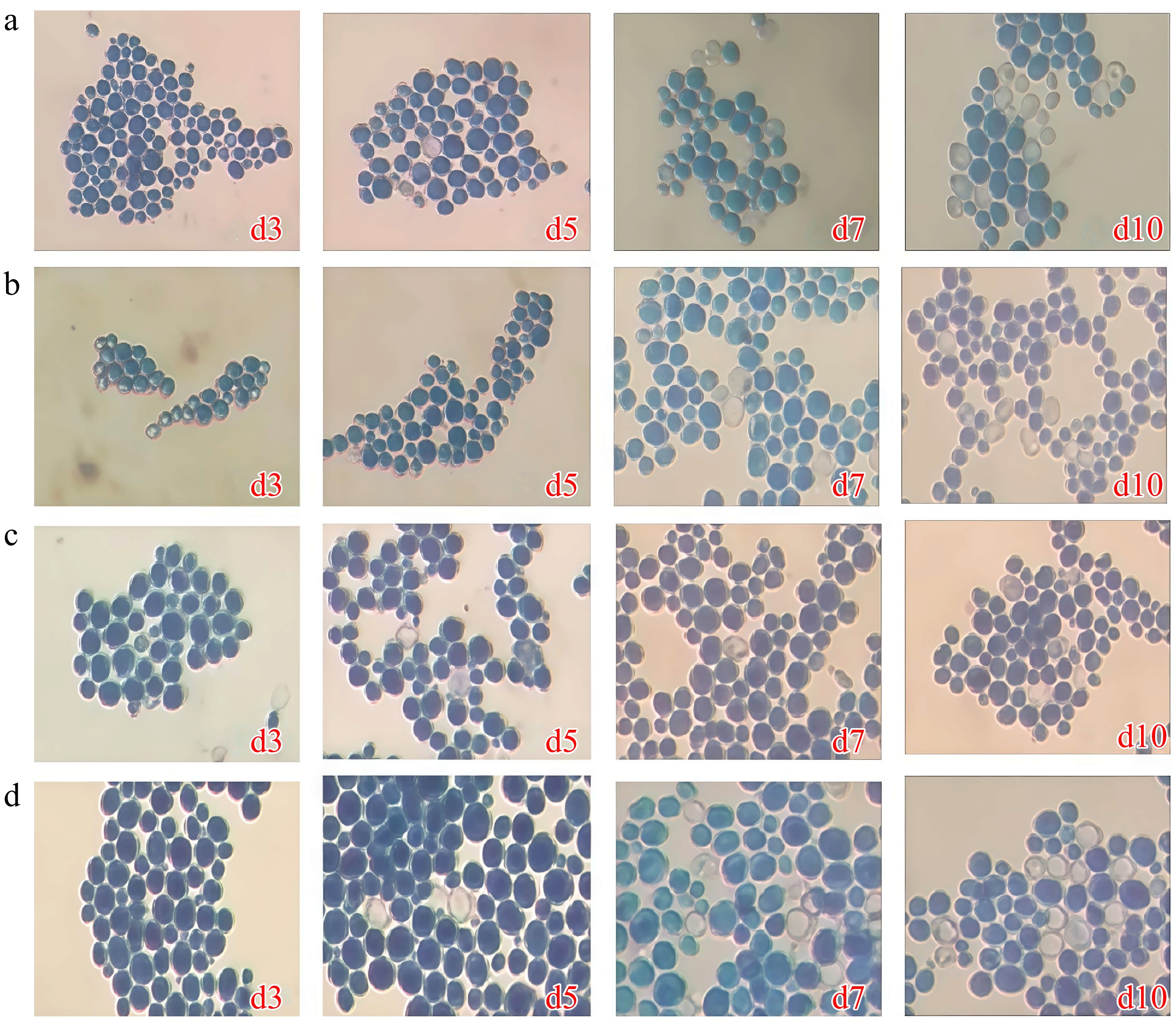 Microscopic examination of S. cerevisiae 31y3 with methylene blue staining (× 400). (a) Kleyn's medium. (b) McClary medium. (c) SPM medium. (d) ACK medium.