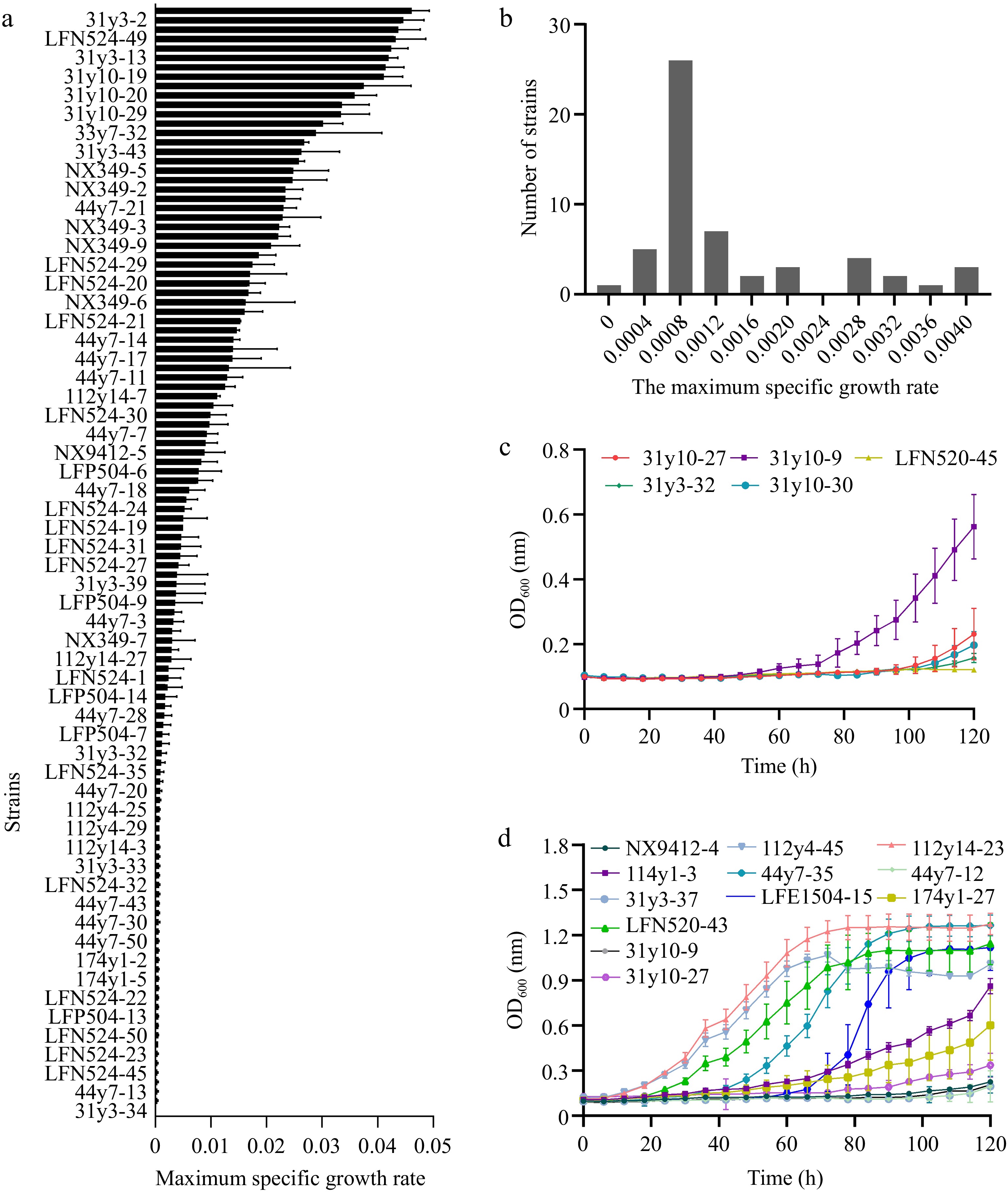 Selection of haploid S. cerevisiae strains with different growth under combined ethanol-osmotic-SO2 stressors. (a) Maximum specific growth rate under combined ethanol-osmotic-SO2 stressors of the parental haploids. (b) Distribution of μmax in the stress-sensitive haploid S. cerevisiae strains. (c) Growth of stress-sensitive haploids in high-stress medium. (d) Growth of stress-tolerant haploids in low-stress medium.