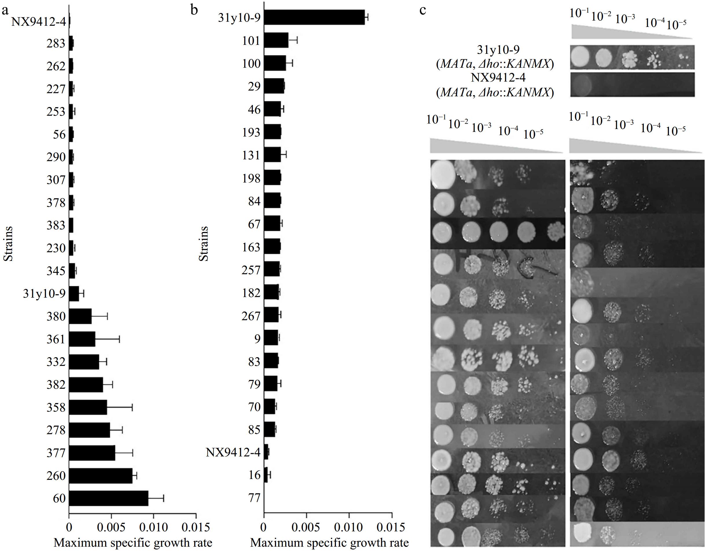 The distribution of the μmax in the F2 segregants and construction of the two extreme pools. (a) Re-screening of the high-tolerance extreme pool. (b) Re-screening of the low tolerance extreme pool. (c) Spot growth of the superior segregants and inferior segregants from the two pools.