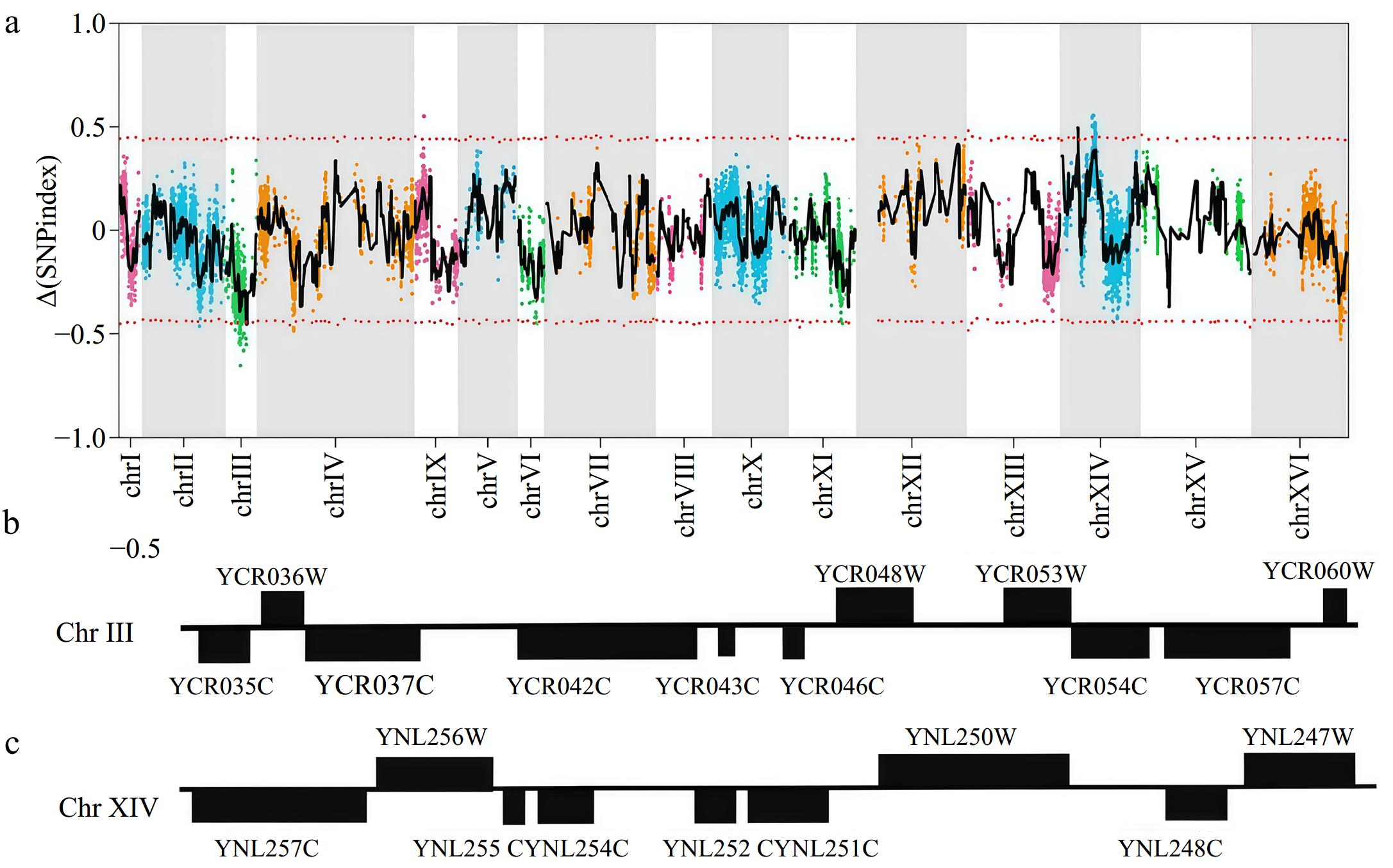 Identification of QTLs by whole-genome re-sequencing analysis. (a) Mapping of the QTLs associated with multi-stress tolerance by pooled-segregant whole-genome sequencing analysis. The X-axis indicates the position of the chromosomes, whilst the Y-axis shows the Δ(SNP-index) values. (b) Overview of genes in the QTL on Chromosome III. (c) Overview of genes in the QTL on Chromosome XIV.