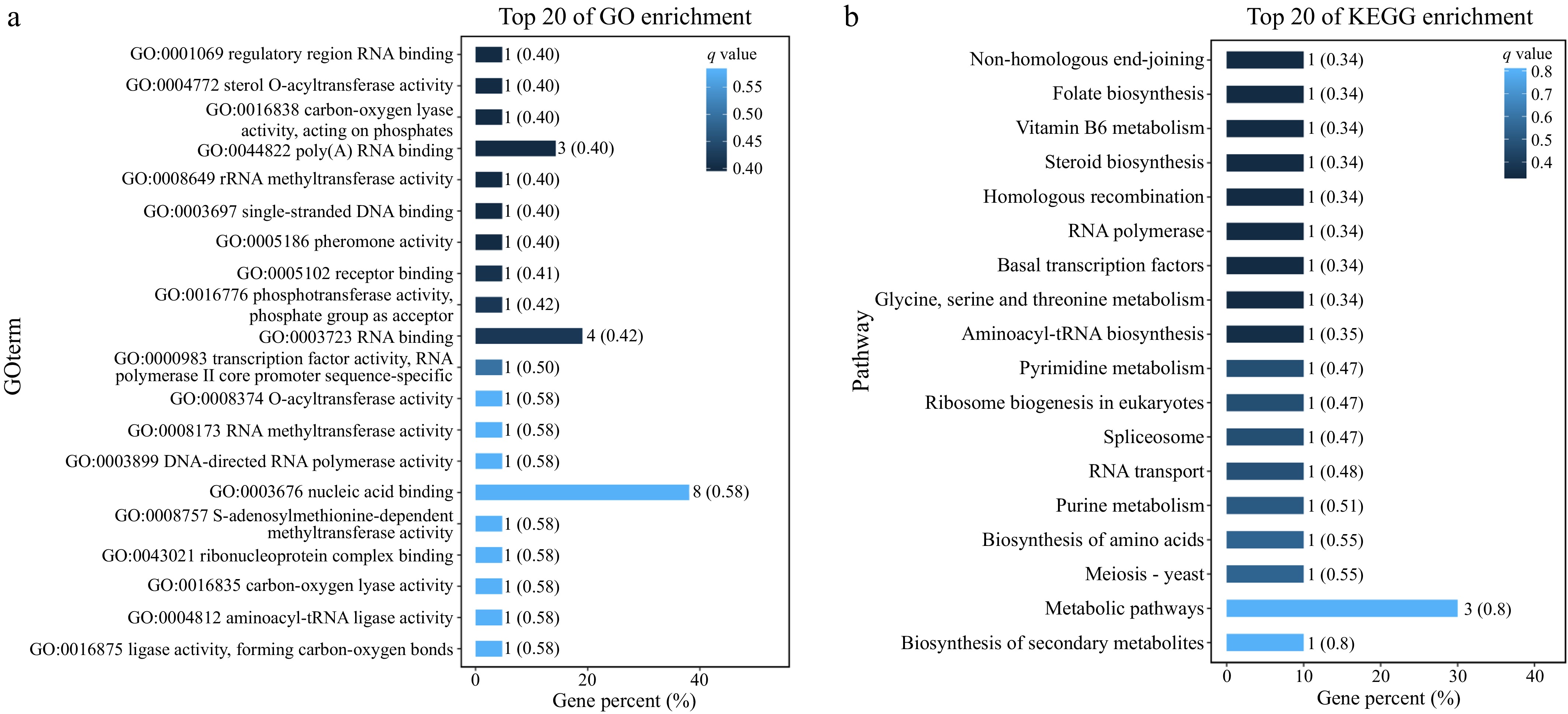 GO enrichment analysis was performed to better understand the effect of candidate genes on physiological activities in yeast cells (Fig. 5a). Results show that the function of the candidate genes mainly involves RNA binding in regulatory regions, sterol O-acyltransferase activity, carboxylase activity acting on phosphate, poly(A)RNA binding, rRNA methyltransferase activity, single-stranded DNA binding, receptor binding, phosphotransferase activity, and transcription factor activity. Based on GO enrichment analysis, a total of seven genes within the QTLs that were possibly associated with combined ethanol-hyperosmotic-SO2 stress tolerance were finally selected and annotated as QTGs (Table 1).