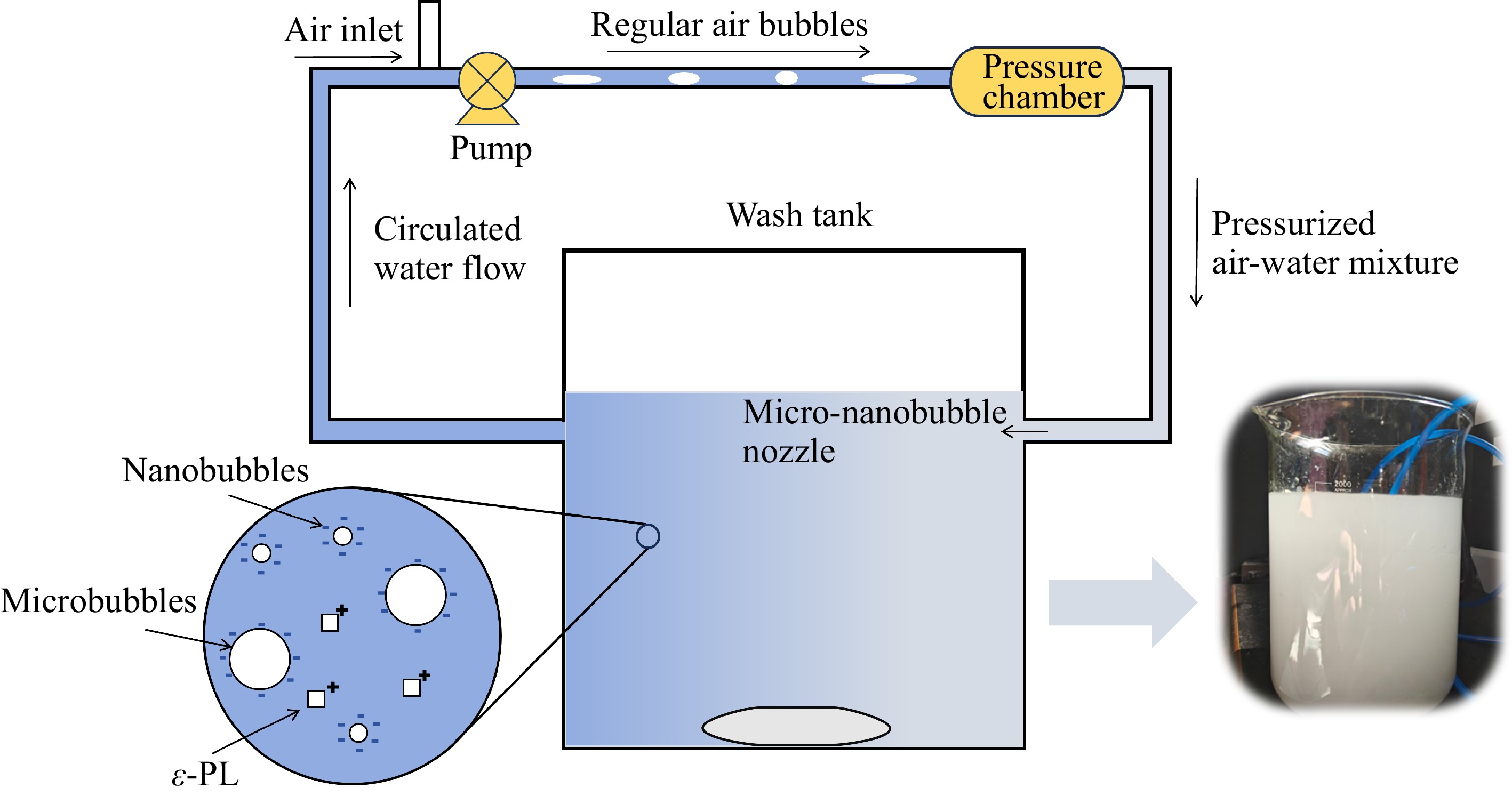 Micro-nanobubble recirculation fresh produce washing set-up along with the milky physical image of air micro-nanobubbles.