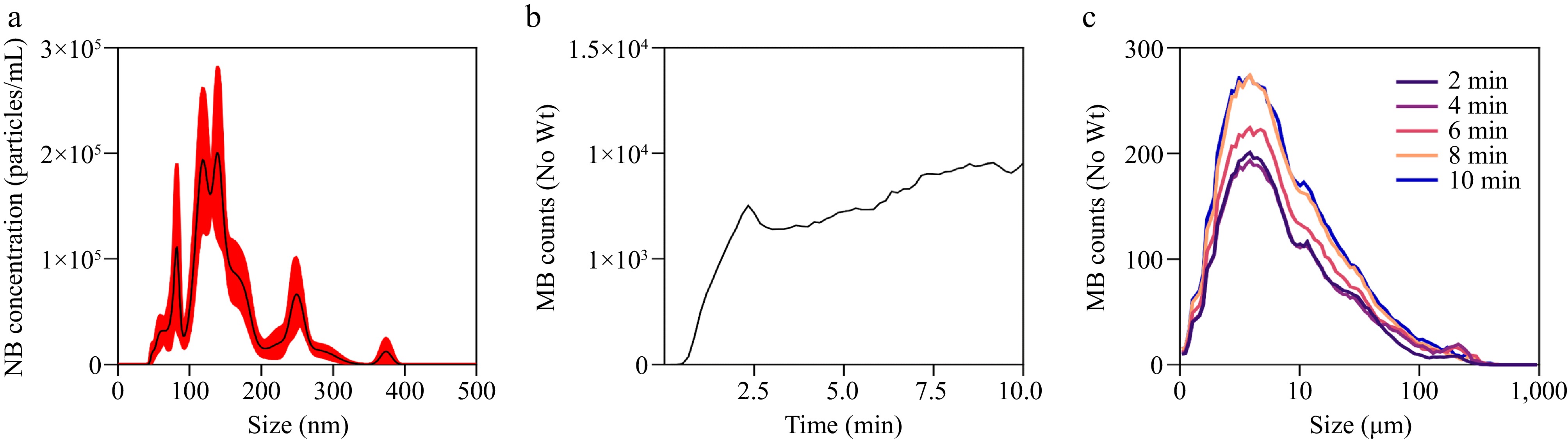 Characteristics of air micro-nanobubble. (a) Nanobubble number-size of air MNB. (b) Microbubble number of air MNB affected by time. (c) Microbubble number-size curves of air MNB affected by time ( 'No Wt' means that the counts of bubbles did not consider the weight).