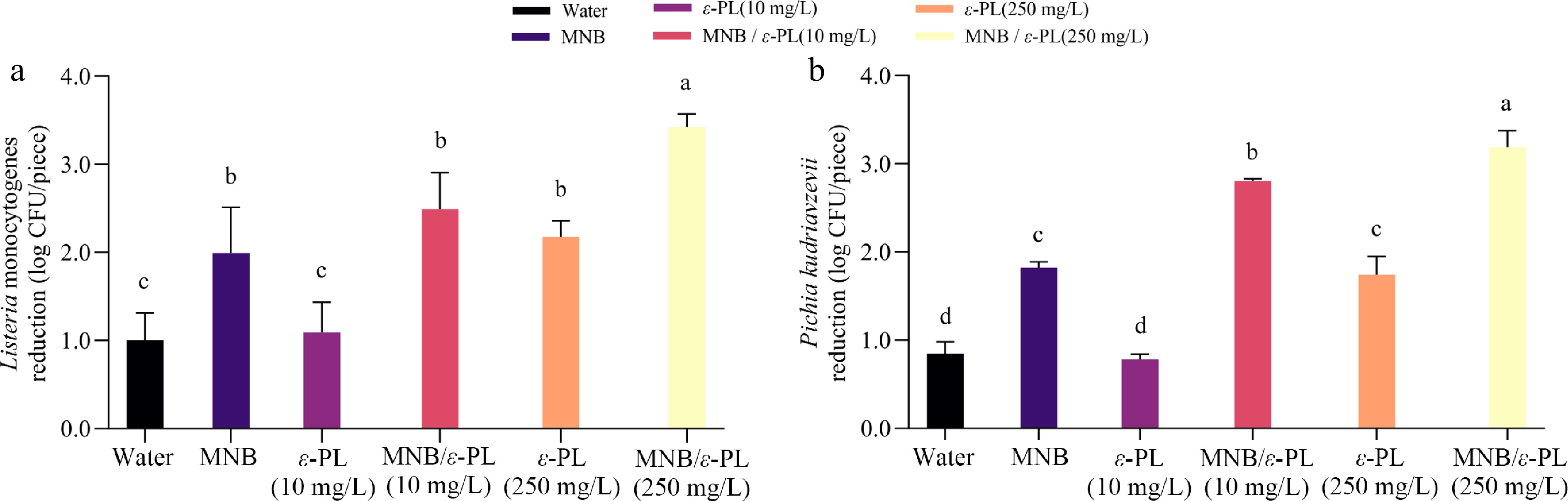 Effect of MNB-assisted washing with ε-PL on microbial reduction against (a) Listeria monocytogenes, and (b) Pichia kudriavzevii. Difference analysis p < 0.05.