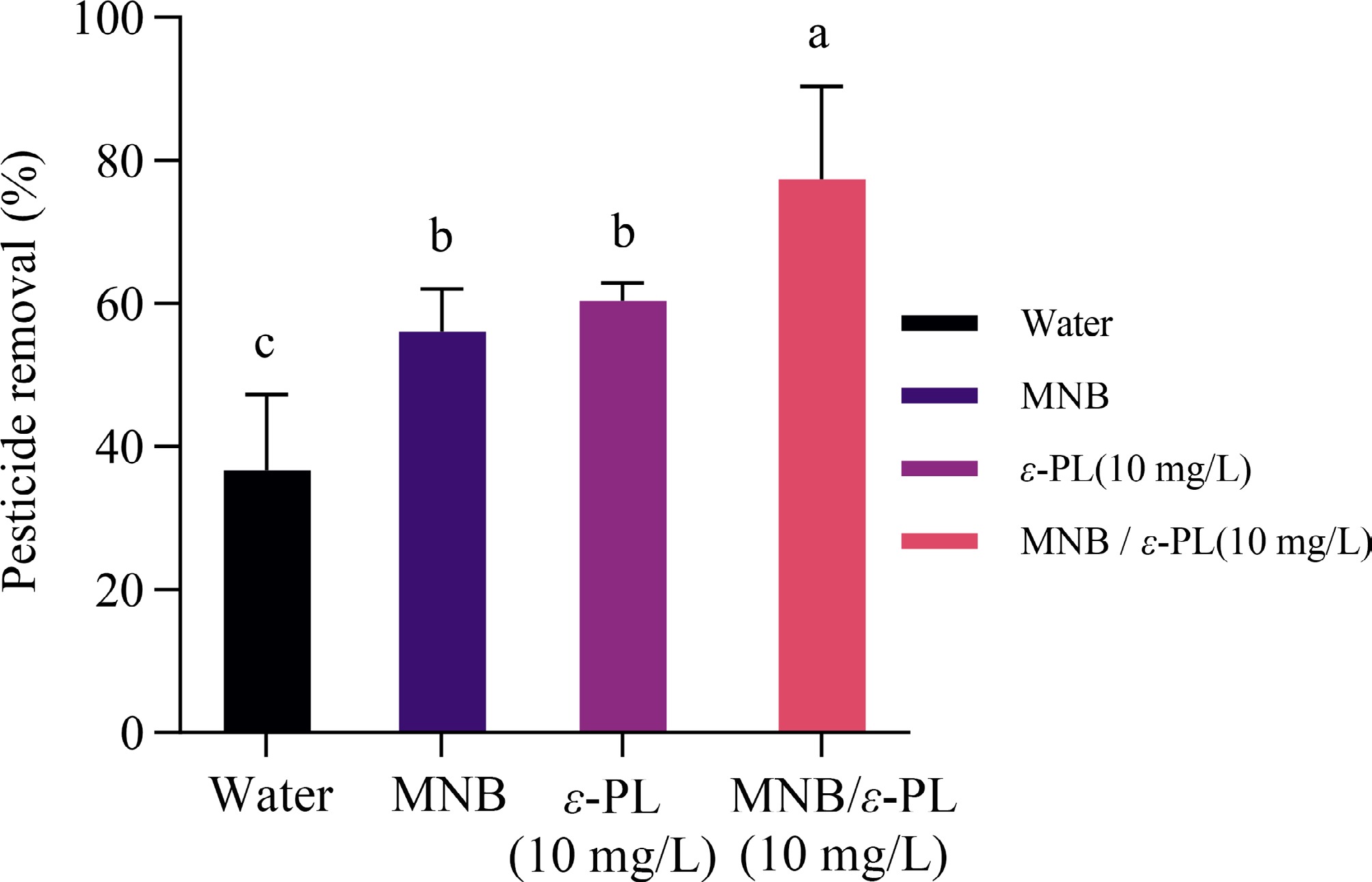 Effect of micro-nanobubbles combined with ε-PL on the removal rate of trichlorfon residues. Difference analysis p < 0.05.