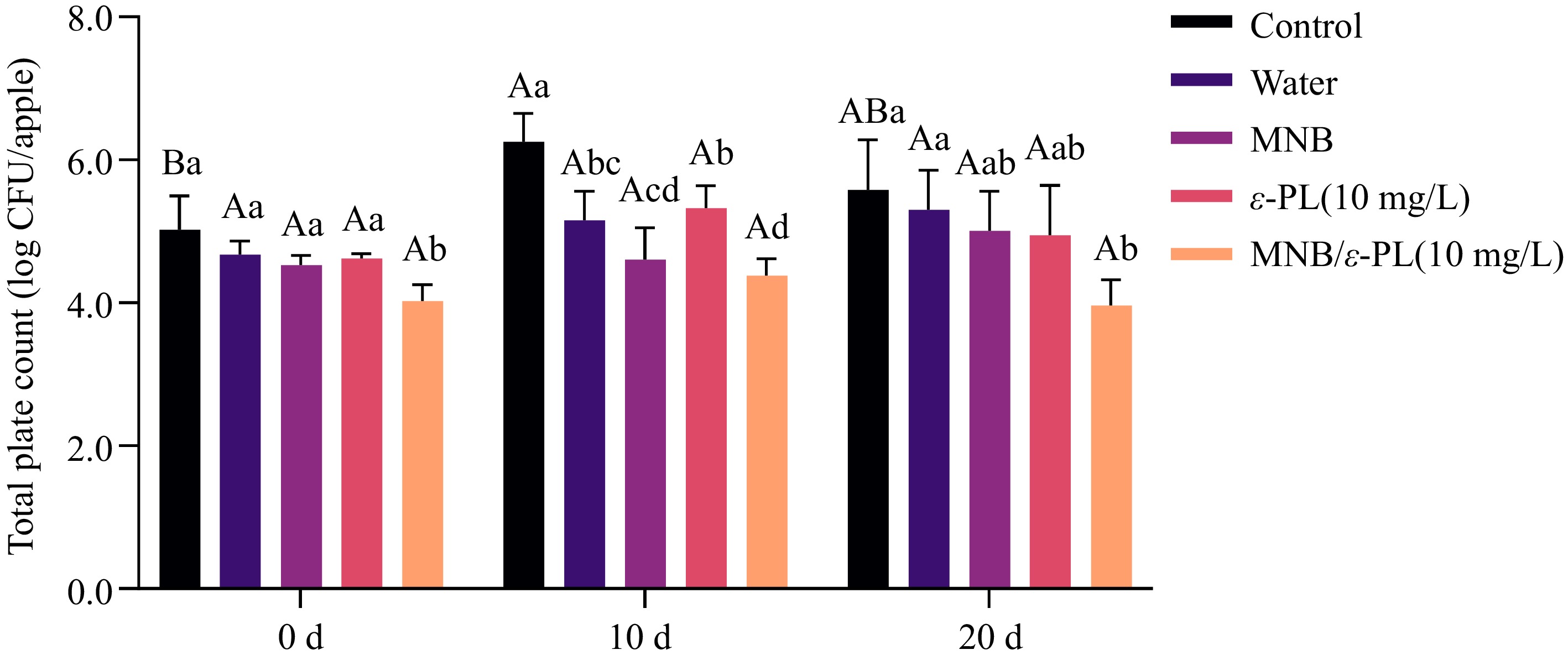 Total plate count of whole apples during storage. Different uppercase letters indicate significant differences between storage periods within the same treatment group, and different lowercase letters indicate significant differences between treatment groups within the same storage period (p < 0.05).