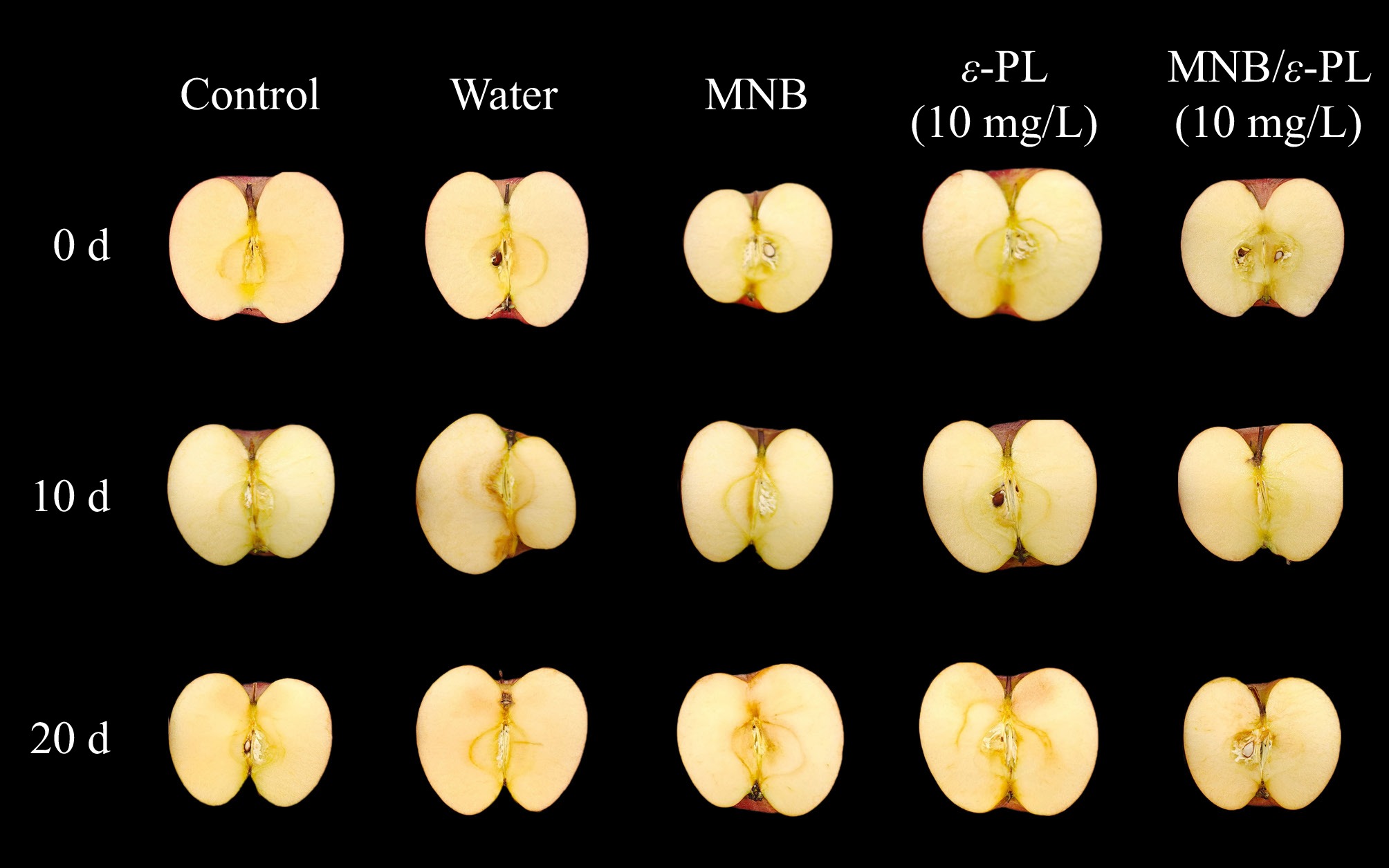 Quality indicators Storage time (d) Control Water MNB ε-PL (10 mg/L) MNB/ε-PL (10 mg/L) L* 0 39.6 ± 4.3Aa 38.9 ± 5.2Aa 38.0 ± 4.3Aa 38.3 ± 6.7Aa 40.6 ± 8.8Aa 10 40.0 ± 4.3Aa 42.4 ± 5.3Aa 42.4 ± 4.3Aa 40.9 ± 6.7Aa 42.7 ± 8.8Aa 20 35.7 ± 2.2Aa 39.6 ± 5.5Aa 38.0 ± 2.8Aa 42.3 ± 4.0Aa 40.1 ± 2.5Aa a* 0 19.7 ± 2.2Aa 17.6 ± 2.8Aa 19.5 ± 1.2Aa 17.6 ± 0.8Aa 15.4 ± 4.6Aa 10 16.4 ± 2.2Ba 15.1 ± 2.8Aa 14.3 ± 1.2Aa 12.8 ± 0.1Ba 11.6 ± 4.6Aa 20 15.1 ± 0.4Ba 13.2 ± 2.2Aa 14.8 ± 1.6Aa 12.3 ± 0.9Ba 12.9 ± 2.6Aa b* 0 13.5 ± 2.2Aa 13.5 ± 4.0Aa 12.4 ± 1.7Aa 14.7 ± 1.9Aa 13.1 ± 4.2Aa 10 17.3 ± 2.2Aa 18.0 ± 4.0Aa 18.0 ± 1.7Aa 19.7 ± 1.9Aa 19.9 ± 4.2Aa 20 16.2 ± 2.1Aa 14.5 ± 4.1Aa 16.6 ± 3.2Aa 16.8 ± 5.3Aa 16.0 ± 5.4Aa BI 0 75.1 ± 3.4Ba 73.7 ± 7.4Aa 74.1 ± 7.2Ba 69.3 ± 6.8Ba 65.5 ± 8.8Ba 10 83.8 ± 4.1Aa 79.3 ± 6.5Aa 78.2 ± 8.4Aba 87.8 ± 6.5Aa 80.0 ± 11.5ABa 20 88.3 ± 4.1Aa 85.4 ± 6.9Aa 91.7 ± 8.4Aa 88.6 ± 6.5Aa 96.5 ± 11.5Aa Hardness (N) 0 73.4 ± 8.0ABab 78.3 ± 7.4Aa 69.6 ± 6.6Aab 63.7 ± 10.7Bb 79.7 ± 13.4Aa 10 80.1 ± 9.6Aa 75 ± 11.5Aba 74.4 ± 13.6Aa 83.3 ± 5.0Aa 75.3 ± 12.3Aa 20 64.9 ± 10.7Ba 65.6 ± 8.5Ba 77.8 ± 6.6Aa 72.6 ± 12.7Ba 68.1 ± 7.8Aa Different uppercase letters indicate significant differences between storage periods within the same treatment group, and different lowercase letters indicate significant differences between treatment groups within the same storage period (p < 0.05). Browning of apple flesh was also investigated by visual observation (Fig. 6). After 20 d of storage, the color of the internal flesh became slightly darker for all samples. Additionally, a few browning spots close to the apple skin and stem were found for water washed sample on day 10 and ε-PL treated sample on day 20. These changes were suspected to be randomly mechanical damages during transportations or washing processes, disrupting fruit cells and causing the release of intracellular enzymatic browning reaction-relevant substances, such as polyphenol oxidase (PPO)[45].