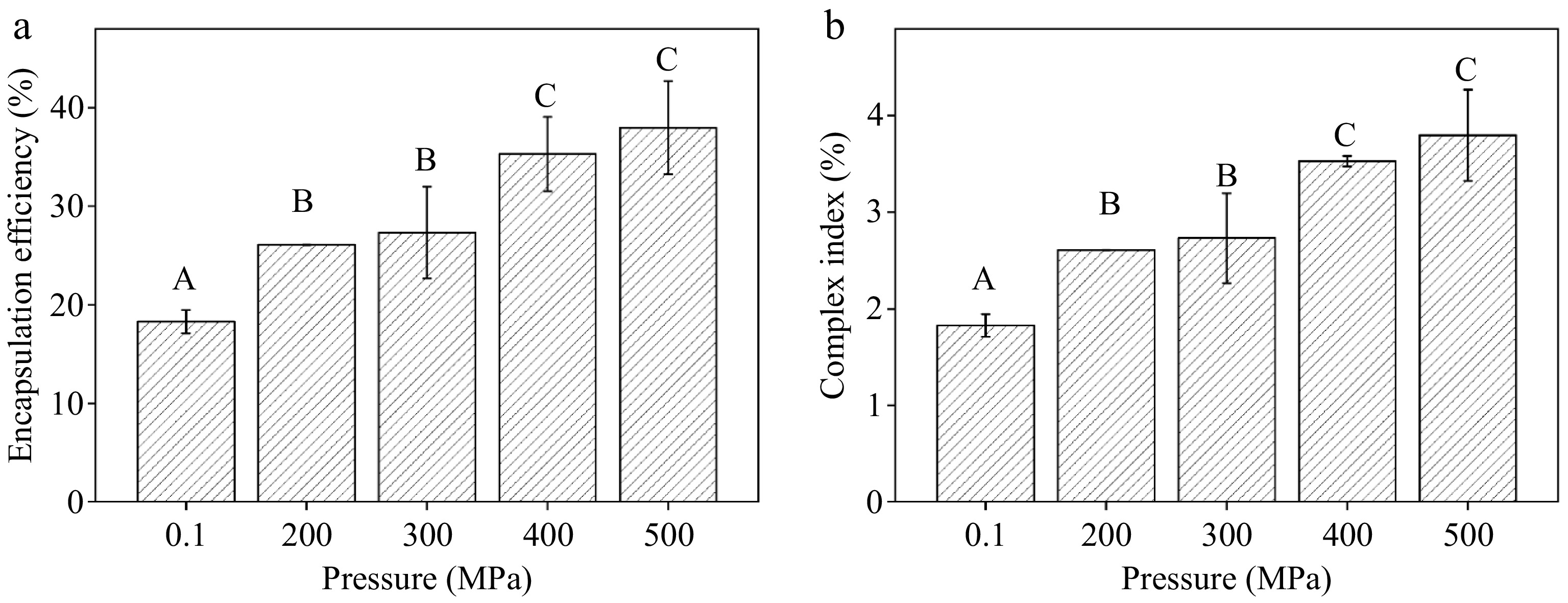 Effect of different pressures on the (a) encapsulation efficiency, and (b) complex index of the CS-LA complex. Note: uppercase letters indicate significant differences in encapsulation efficiency and binding between corn starch-linoleic acid complexes under different pressure conditions (p < 0.05).