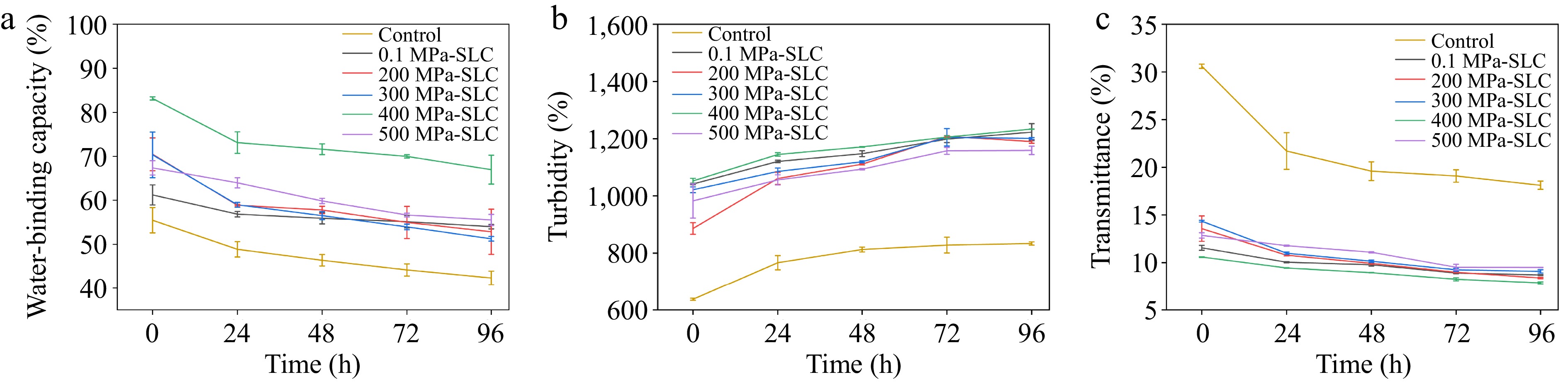 The samples were placed in polyethylene bags and subjected to HPP treatment at 200, 300, 400, and 500 MPa for 10 min at 30 °C. Subsequently, the obtained SLC was centrifuged (4,000 × g for 20 min), eluted with 50% ethanol, dried, and then ground to pass through a 60-mesh sieve. The samples were stored until future analysis.