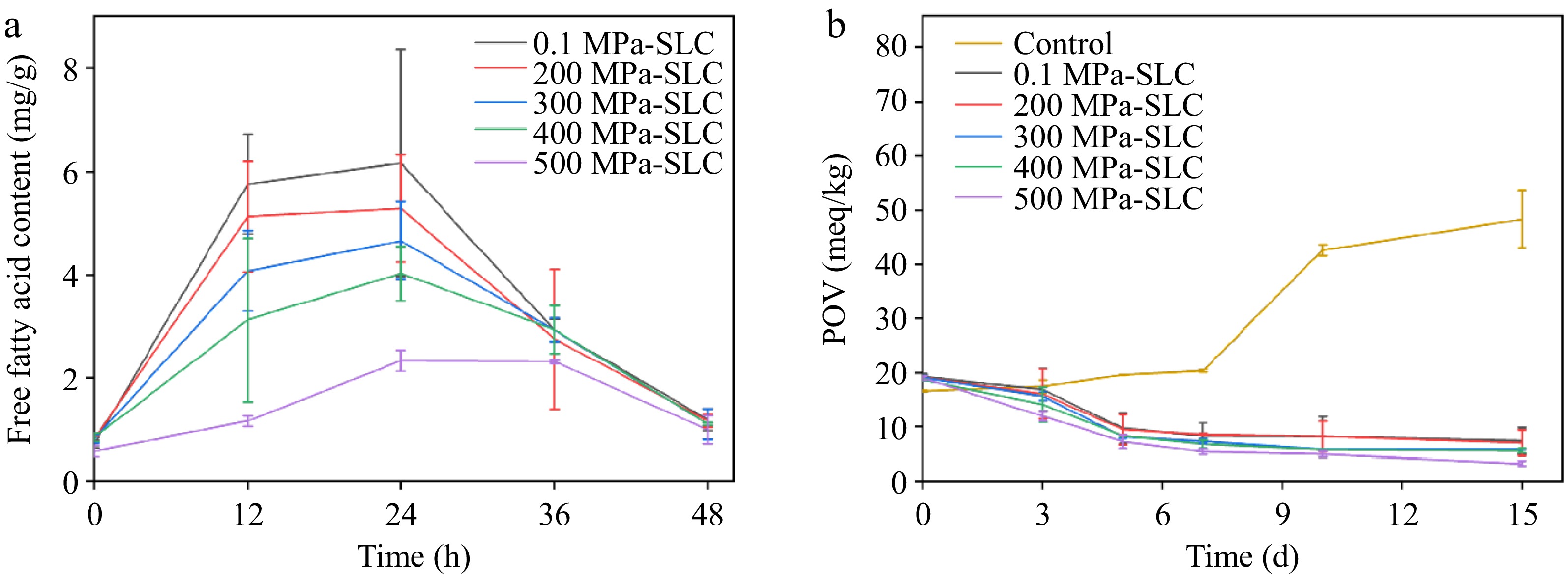 (a) Free fatty acid content of CS-LA complex treated with different pressures during drying. (b) POV of CS-LA complex treated with different pressures for 10 min and LA during storage at 65 °C.