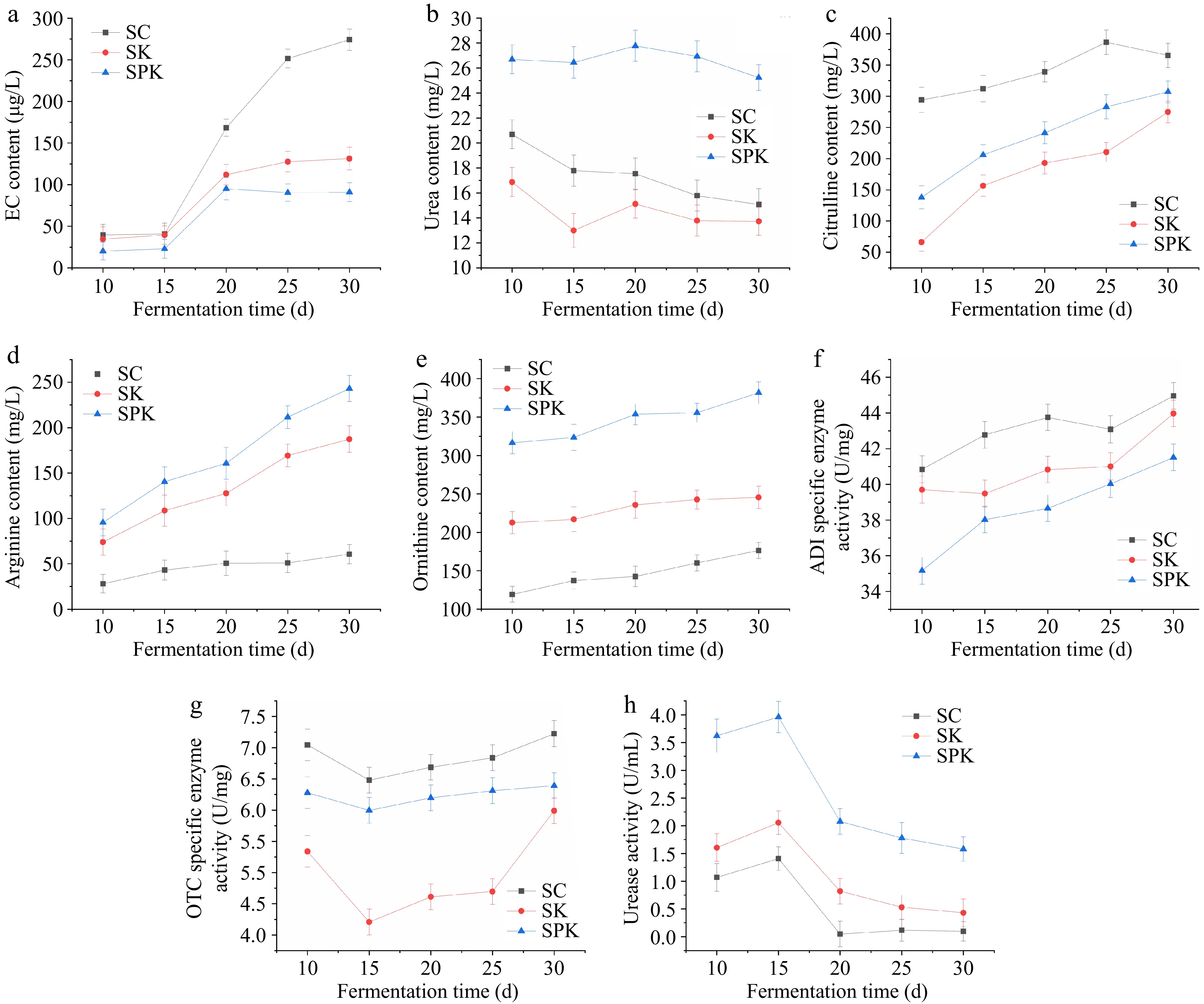 As can be seen from Fig. 2f, g, the ADI activities of SK and SPK were reduced compared with the control group. This reduction would result in a greater consumption of arginine in SC, thereby generating more citrulline and EC, which is consistent with the fingdings presented in Fig. 2a, c. According to Fig. 2g, mixed fermentation could increase OTC activity. This might accounted for the lower EC content in the mixed-culture group compared with the single-culture group.