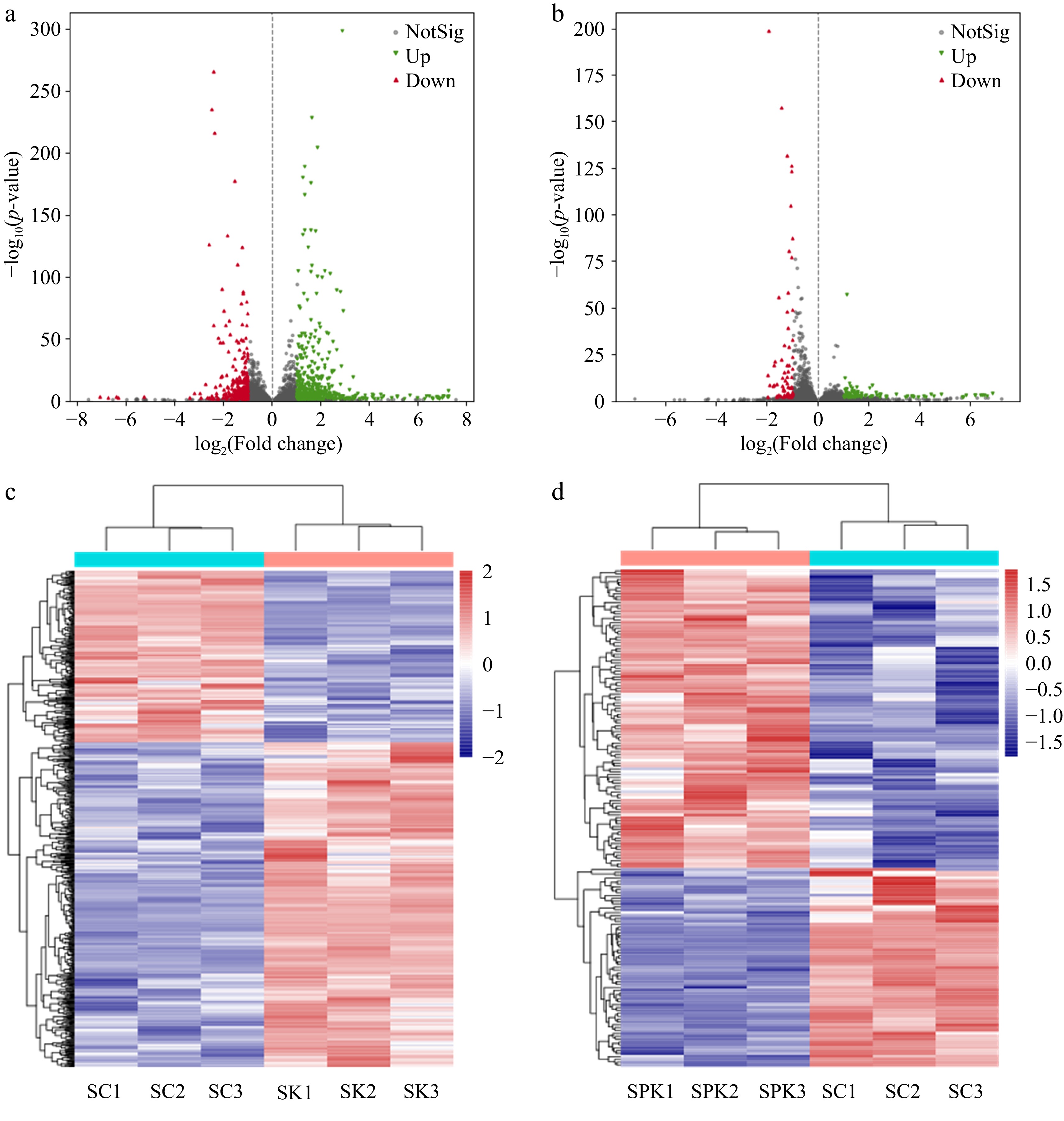 Heatmap and volcano plot of DEGs. (a) DEGs in SK. (b) DEGs in SPK. (c) Volcano plot of DEGs in SC and SK. (d) Volcano plot of DEGs in SC and SPK. SPK, BTN2 knockout strain with PP; SK, BTN2 knockout strain.