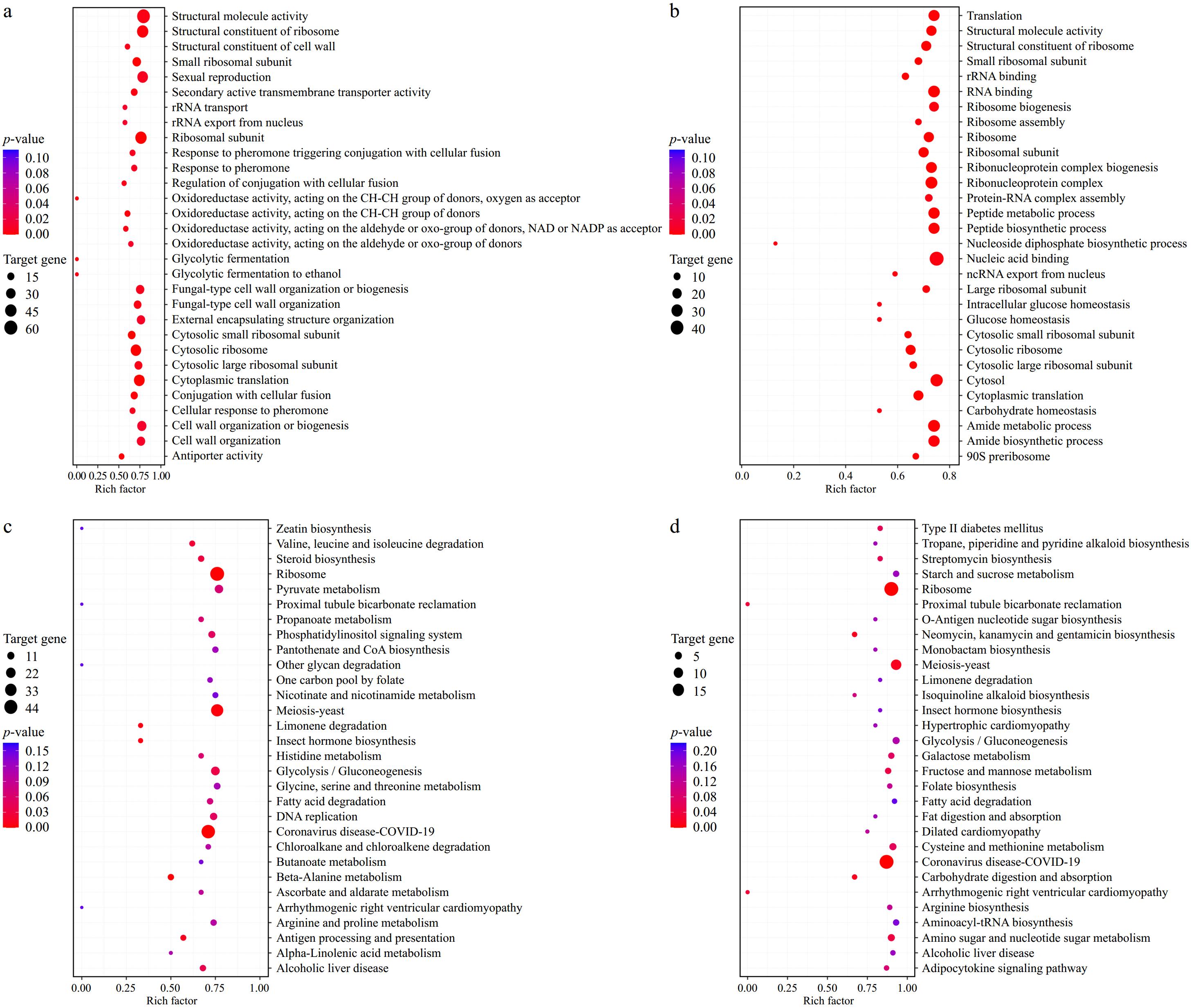 Figure 4b indicates that the DEGs in SPK participated in a total of 25 molecular functions. Compared with the single-culture fermentation group, the genes involved in molecular functions decreased. Most genes were associated with biological processes, such as bio-regulation, cellular processes and metabolic processes. This suggested that mixed-culture fermentation has a greater impact on the biological processes of S. cerevisiae.