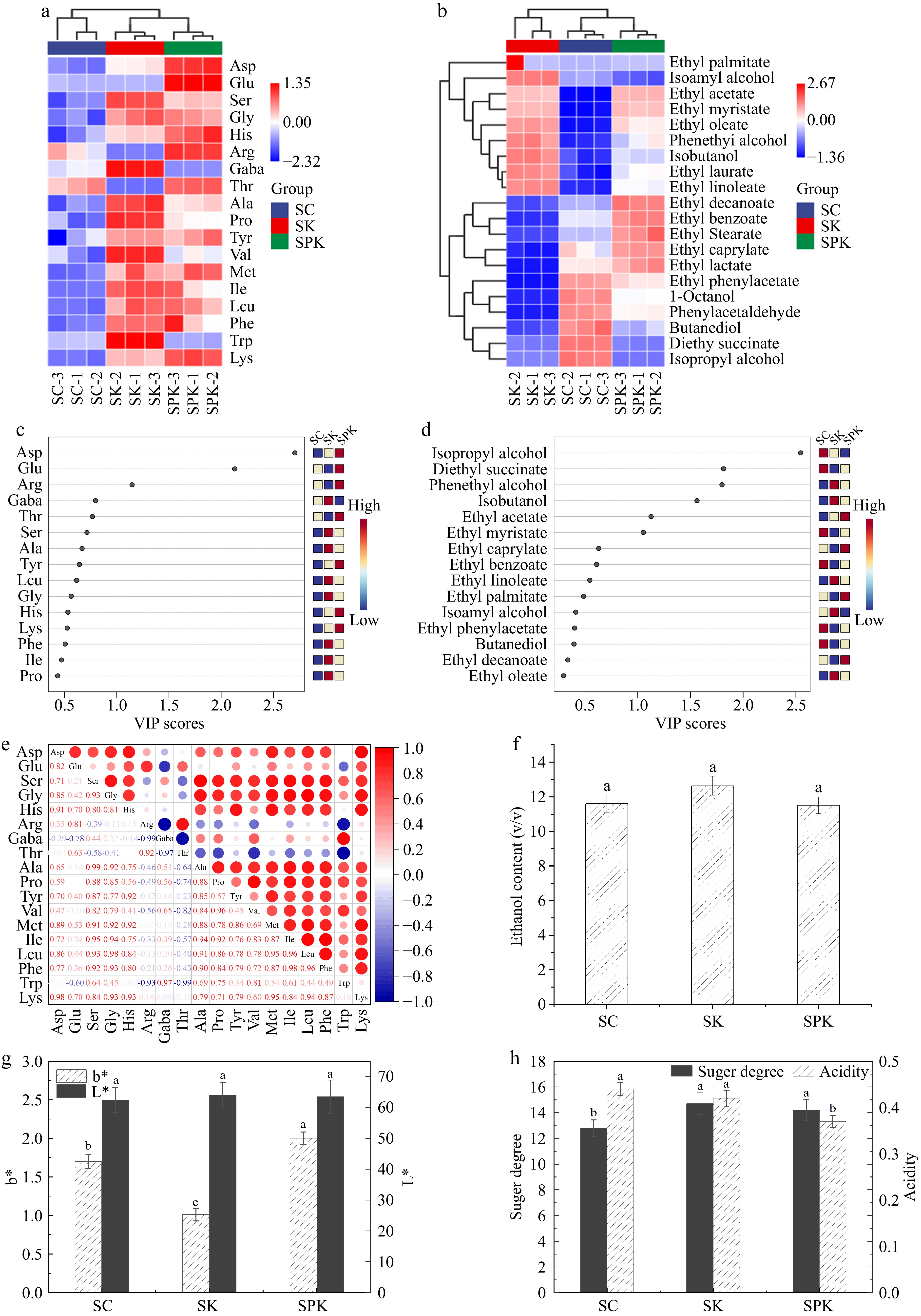 Analysis of amino acids and volatile flavor substances in Huangjiu under different fermentation systems. (a) Cluster heat map analysis of free amino acids in Huangjiu. (b) variable importance inprojection (VIP) scores of free amino acids under different fermentation systems. (c) Heat map of free amino acid correlations. (d) Cluster heat map analysis of volatile flavor substances (e) VIP score of volatile flavor substances under different fermentation systems. (f) Alcohol content. (g) b* and L* values. (H) Sugar–acid ratio. SPK, BTN2 knockout strain with PP; SC, S. cerevisiae; SK, BTN2 knockout strain.