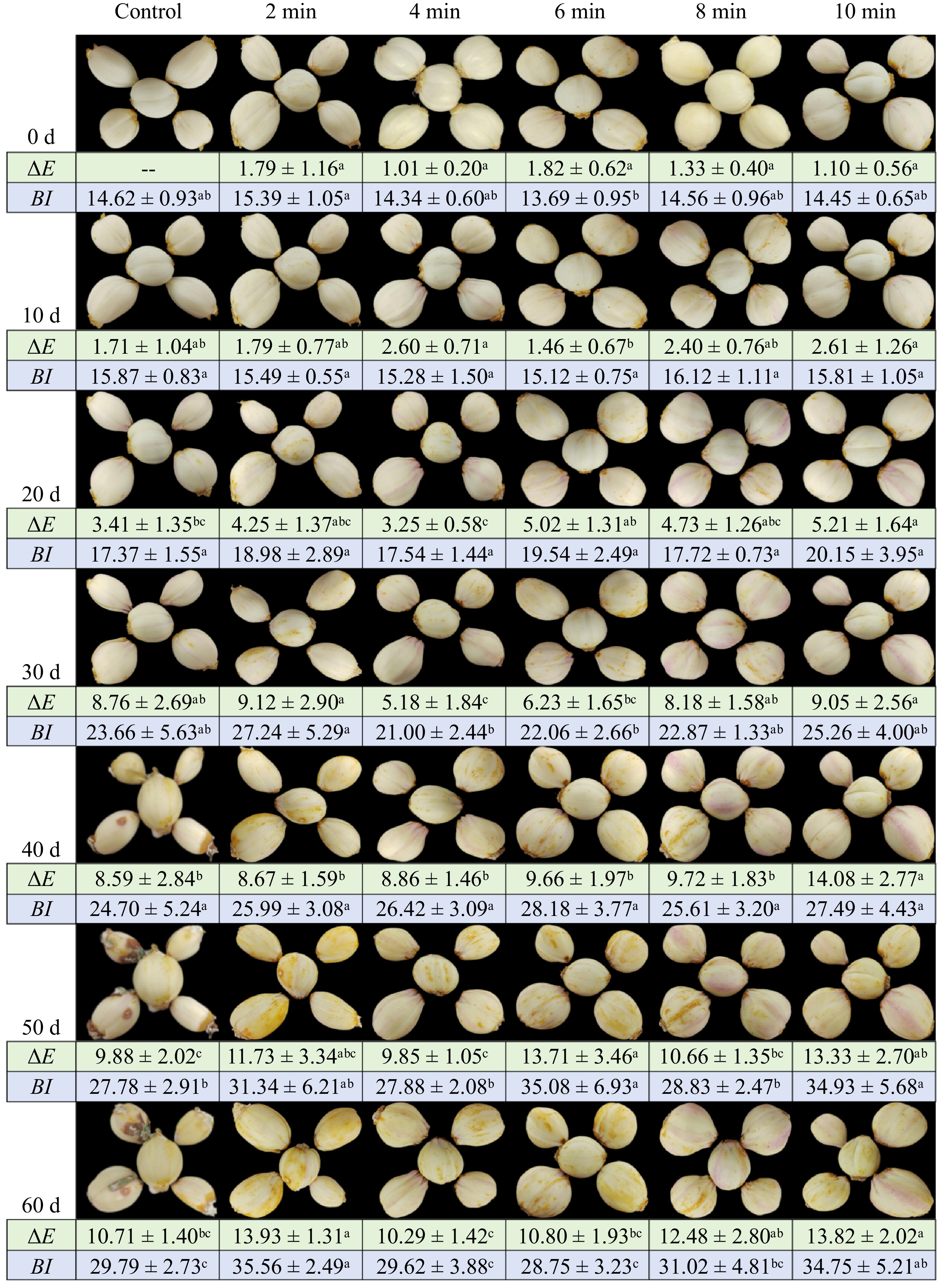 The ∆E of the samples treated with CDP for 10 min exhibited the highest value compared to the control and CDP-4-min samples (Fig. 2), which showed the lowest luminosity. No statistically significant difference (p > 0.05) in ∆E values was observed among treatment groups at the initial storage time point (0 d). However, as storage progressed, the CDP-10-min treated samples consistently displayed significantly elevated ∆E values, whereas the control and CDP-4-min samples remained at comparable levels with no significant inter-group differences (p > 0.05).