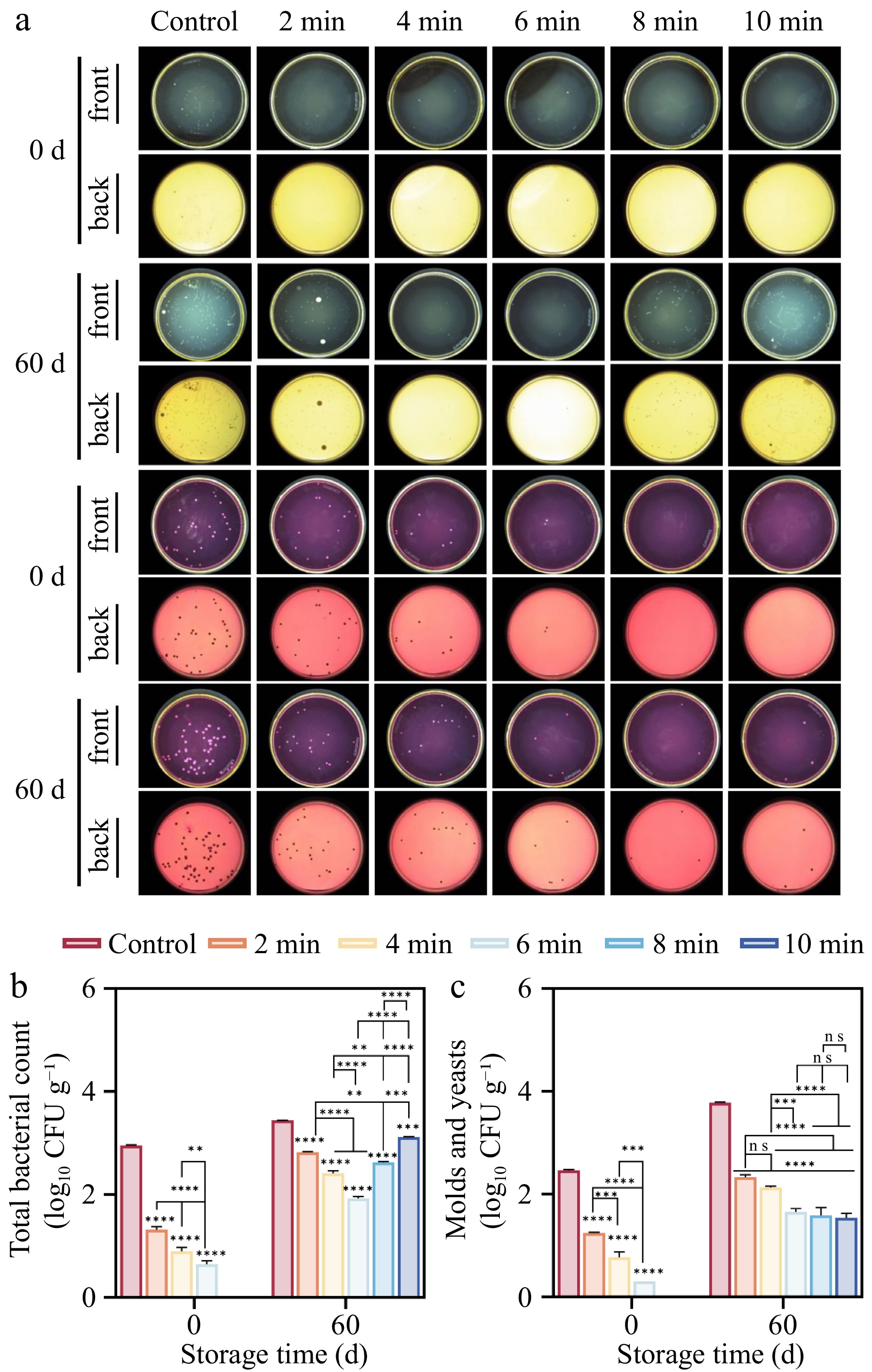 Blue mold disease, primarily caused by fungal species of Penicillium, represents a prevalent postharvest pathological condition in lily bulbs. This disease not only compromises the visual quality and marketable shelf life of the bulbs but also facilitates the accumulation of mycotoxins within lily tissues, thereby posing potential health risks to consumers[31]. In this study, the number of total bacterial, molds, and yeasts were identified as core indictors to evaluate the quality of lilies treated with CDP (Fig. 4). As shown in Fig. 4b, c, the total bacterial and mold & yeast sterilization efficacy peaked at 69.52% and 68.64%, respectively, when the samples were treated for 4 min or longer at the start of the storage period (0 d). The sterilization efficacy reached 100% for the 8-min and 10-min treatments. After 60 d of storage, the total bacterial count in the 6-min treated samples dropped to the lowest level (1.93 log10 CFU g−1), with an inhibition rate of 43.95%. The mold and yeast quantities in the 6, 8, and 10-min treatment samples were significantly lower than those in the other treatment samples (p < 0.001). Notably, there was no significant difference in the mold and yeast quantities among the 6, 8, and 10-min treatment samples.