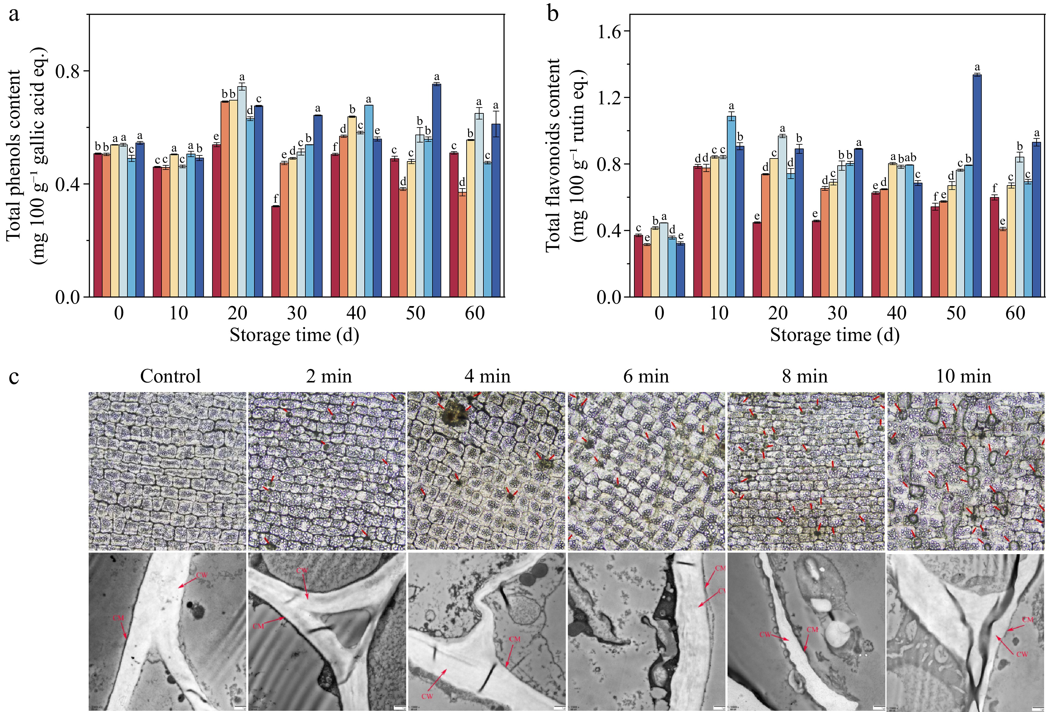 The TPC (Fig. 5a), and TFC (Fig. 5b) of the samples exhibited an initial increase followed by a subsequent decrease during the storage period. By the end of the storage period, all treatments, except the CDP-2-min sample, were able to prevent the decline in TPC and TFC. At the 60th d of storage, the CDP-6-min treatment exhibited the highest TPC, reaching 0.65 g 100 g−1, which was 1.27 times higher than the control group. Furthermore, the TFC of the CDP-6-min sample was 40.54% higher than that of the control sample.