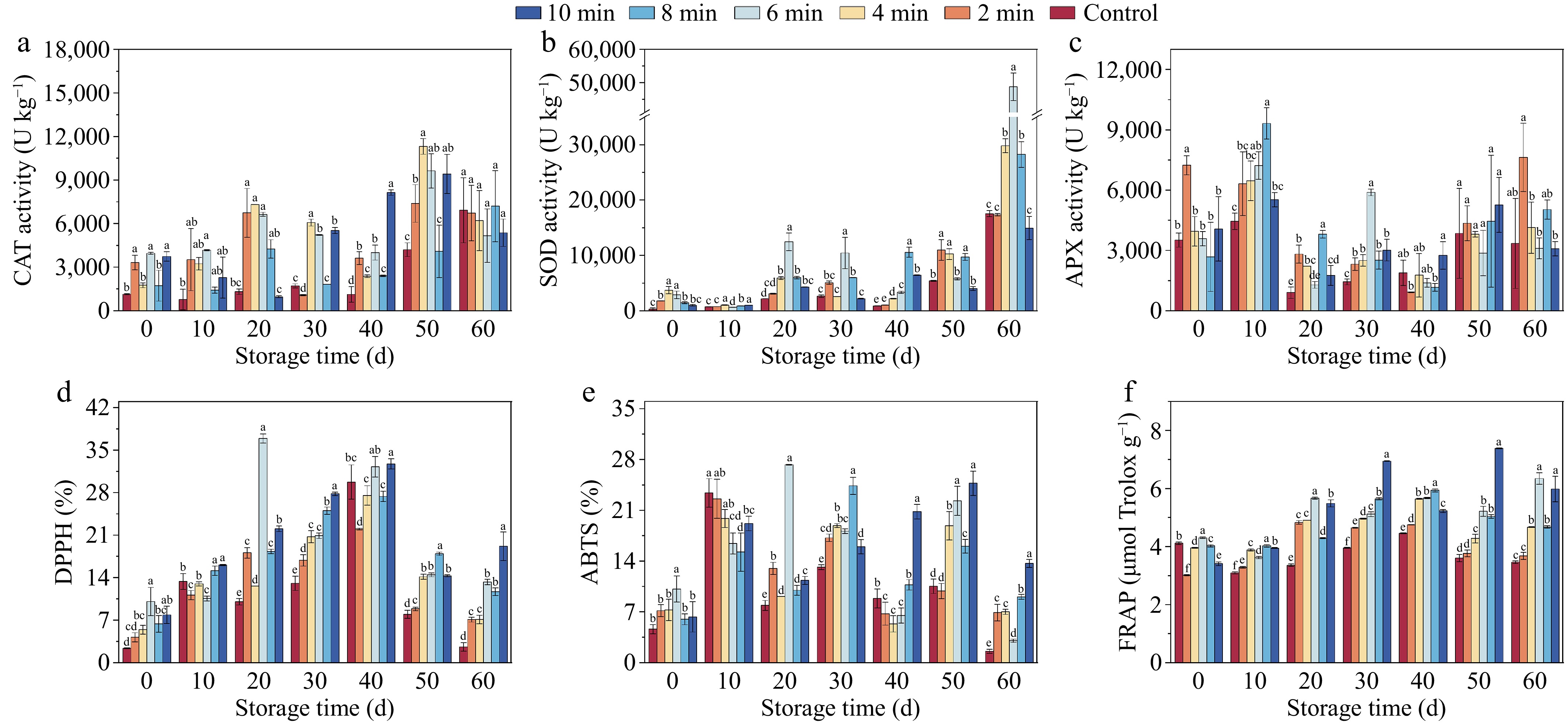 The enzyme activities and antioxidant properties of lily bulbs during storage under different CDP treatment times. (a) Catalase (CAT) activity. (b) Superoxide dismutase (SOD) activity. (c) Ascorbate peroxidase (APX) activity. (d) DPPH radical scavenging activity. (e) ABTS radical scavenging activity. (f) Ferric ion-reducing antioxidant power (FRAP). Different lowercase letters indicate significant differences among treatments at equivalent storage durations (p < 0.05).
