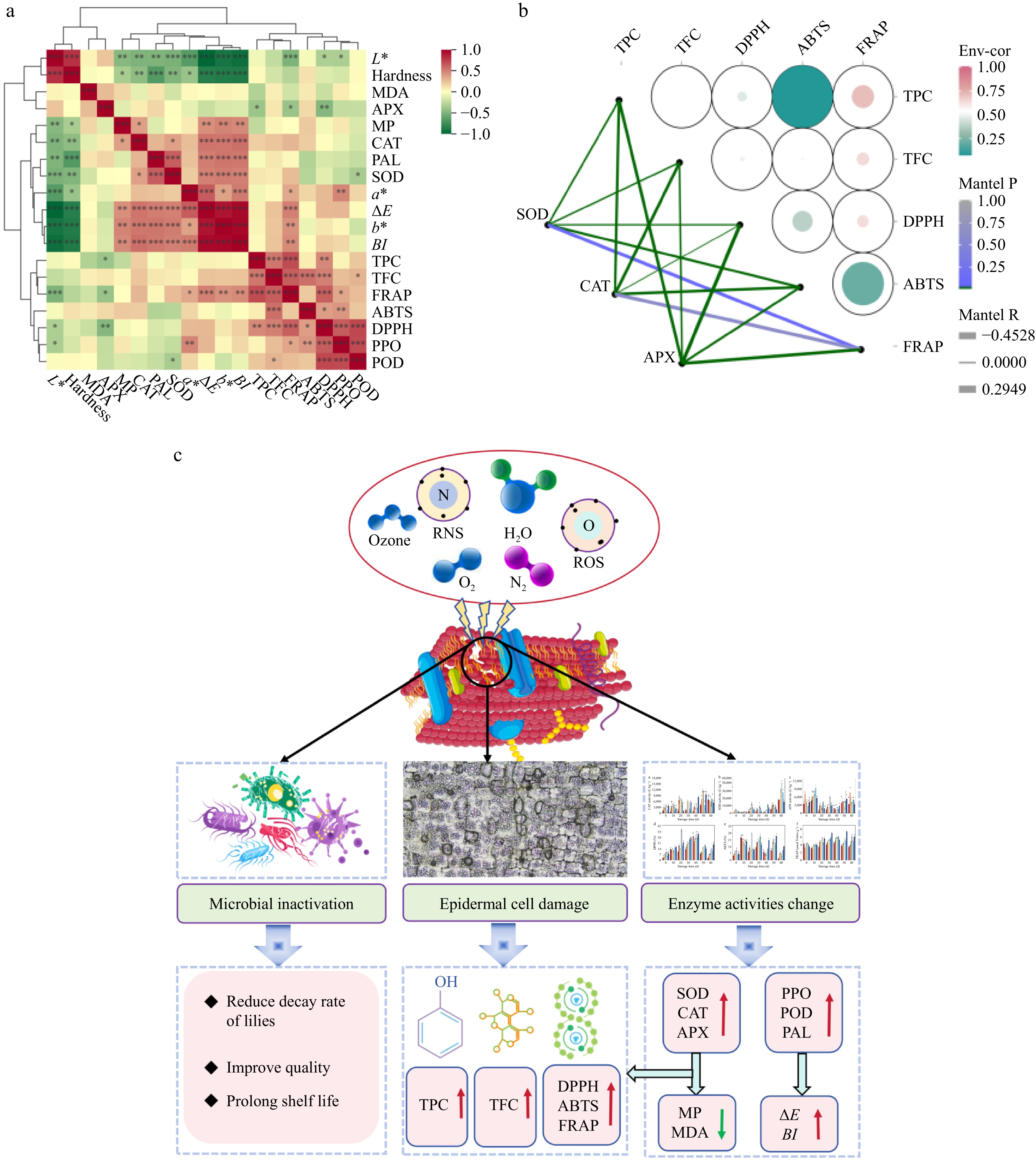 The correlation between the indices of lily during storage and the potential mechanism of lily bulbs. (a) The correlation between the indices of lily during storage. (b) The correlation between CAT, SOD, APX, and antioxidant activity of lily bulbs during storage. (c) The mechanism of the variations in quality attributes of lilies during storage induced by CDP pretreatment (the red arrow symbolizes ascent or promotion, while the green arrow signifies descent or inhibition).