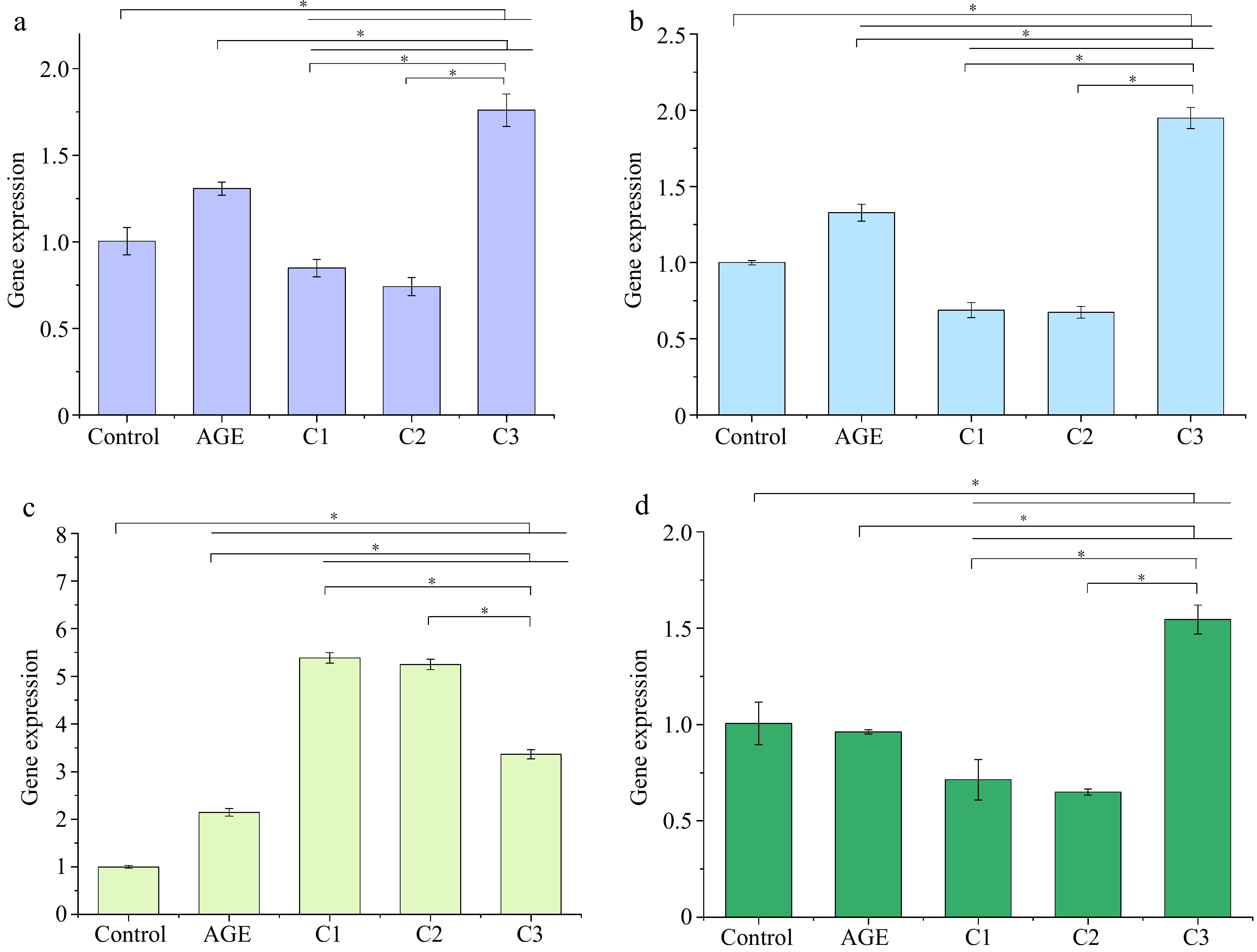 - Supplementary Fig. S11 Cluster analysis of the expression of target genes in the AGE-RAGE pathway. Control is the untreated control group, AGE refers to the group treated with AGEs, C1 represents the group treated with 100% quercetin, C2 represents the group treated with 50% quercetin + 50% caffeic acid, and C3 represents the group treated with 100% caffeic acid.