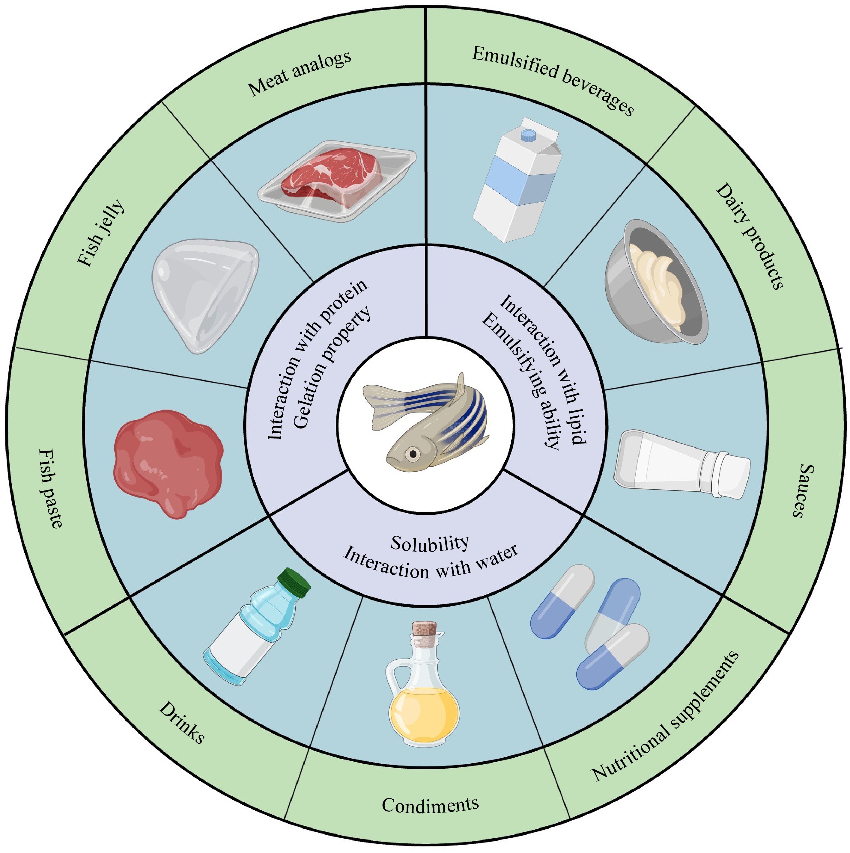 • Aside from physical, chemical, and biological methods, the modification of fish proteins through other methods has been widely studied to enhance their functional properties. These modifications, ranging from the addition of specific substances to deep eutectic solvents and emerging AI-assisted techniques, are designed to improve the structural integrity, solubility, emulsifying ability, and gel strength of fish proteins, offering a versatile approach to meet diverse application demands in the food industry.