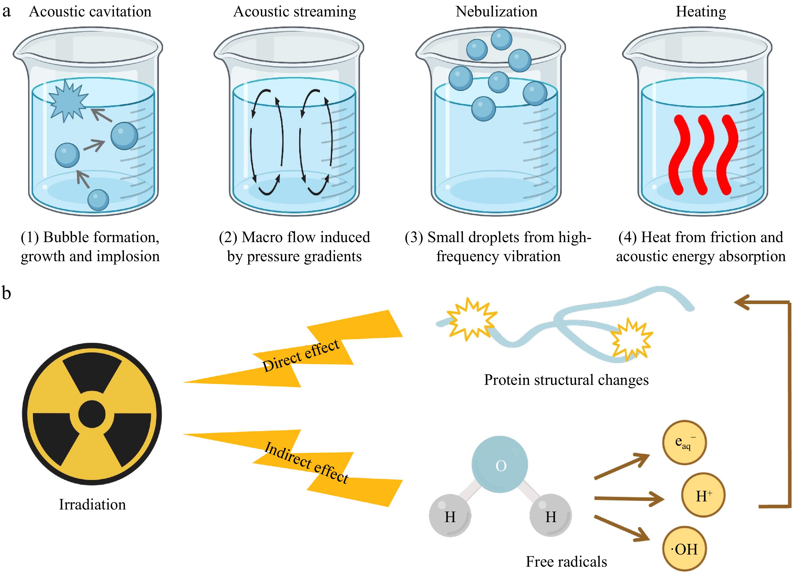 Mechanisms of (a) ultrasound, and (b) irradiation on fish protein modification.