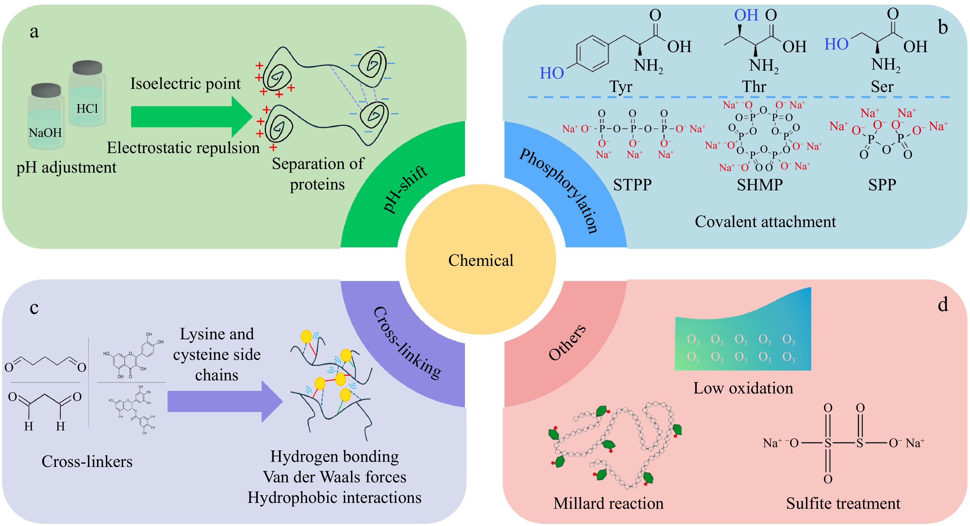 Chemical modification methods of fish proteins: (a) pH-shift, (b) phosphorylation, (c) cross-linking, and (d) others.