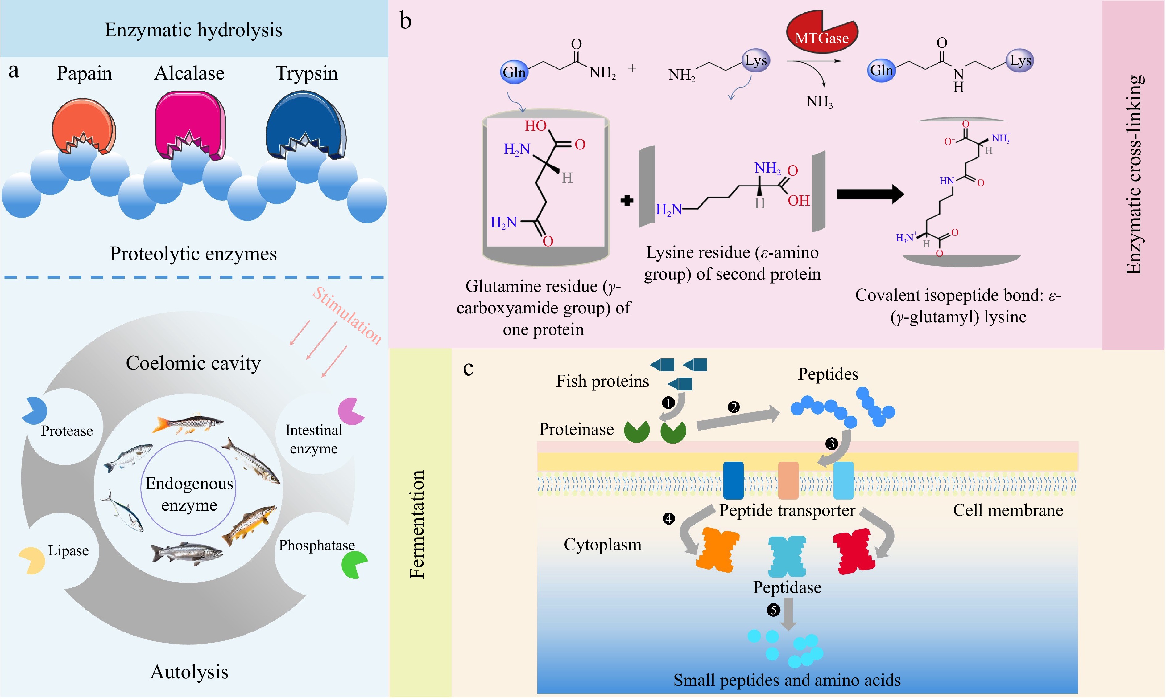 Biological modification methods of fish proteins. (a): Enzymatic hydrolysis, partly adapted from Huang et al.[61]; (b): Enzymatic cross-linking[63]; (c): Fermentation.
