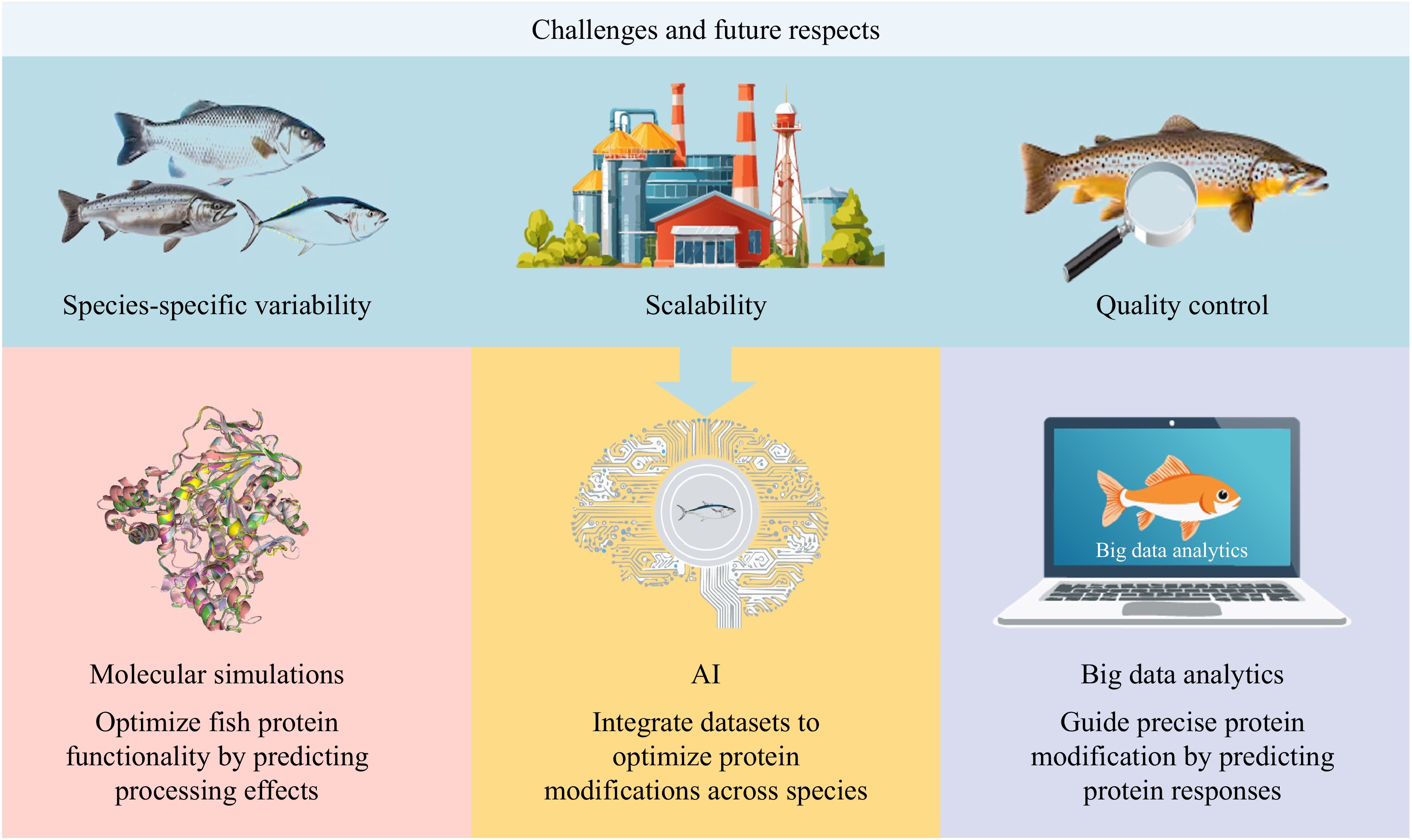 • The modification of fish proteins has advanced through physical, chemical, and biological methods. However, challenges such as species-specific variability, scalability, and quality control necessitate innovative solutions (Fig. 7). The intersection of fish protein modification with advanced technologies such as molecular simulations, AI, and big data analytics presents a transformative opportunity to optimize processes, enhance sustainability, and address industry challenges. By incorporating these advanced tools, researchers and industries can enhance the precision and efficiency of fish protein modification methods, unlocking new potential in the field. Molecular simulations provide powerful insights into the structural and functional behavior of fish proteins under various modification conditions. By using techniques such as molecular dynamics and quantum mechanics/molecular mechanics simulations, researchers can predict how proteins respond to enzymatic hydrolysis, pH-shifting, or high-pressure treatments at the atomic level[88]. These simulations can reveal the effects of specific treatments on protein folding, stability, and binding affinities, guiding the design of precise and effective modification strategies. For example, molecular dynamics simulations can model the impact of enzymatic cleavage on protein solubility and identify optimal cleavage sites, while quantum mechanics/molecular mechanics simulations can predict how phosphorylation affects emulsification properties.
