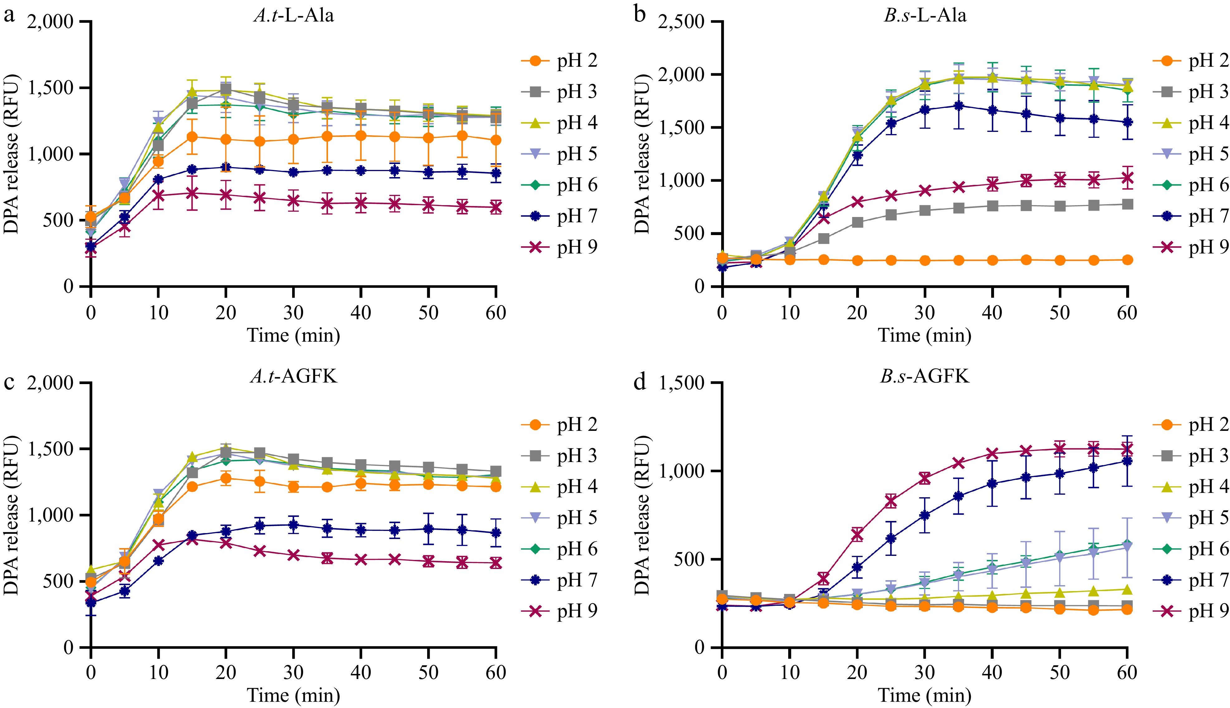 Germination of A. acidoterrestris (A.t) and B. subtilis (B.s) spores induced by nutrient germinants under pH conditions. (a) DPA release from A. acidoterrestris spores induced by 10 mM L-alanine. (b) DPA release from A. acidoterrestris spores induced by 10 x AGFK; DPA release from B. subtilis spores induced by (c) 10 mM L-alanine, and (d) 10 x AGFK. Each experiment in the figure included three replicate groups.