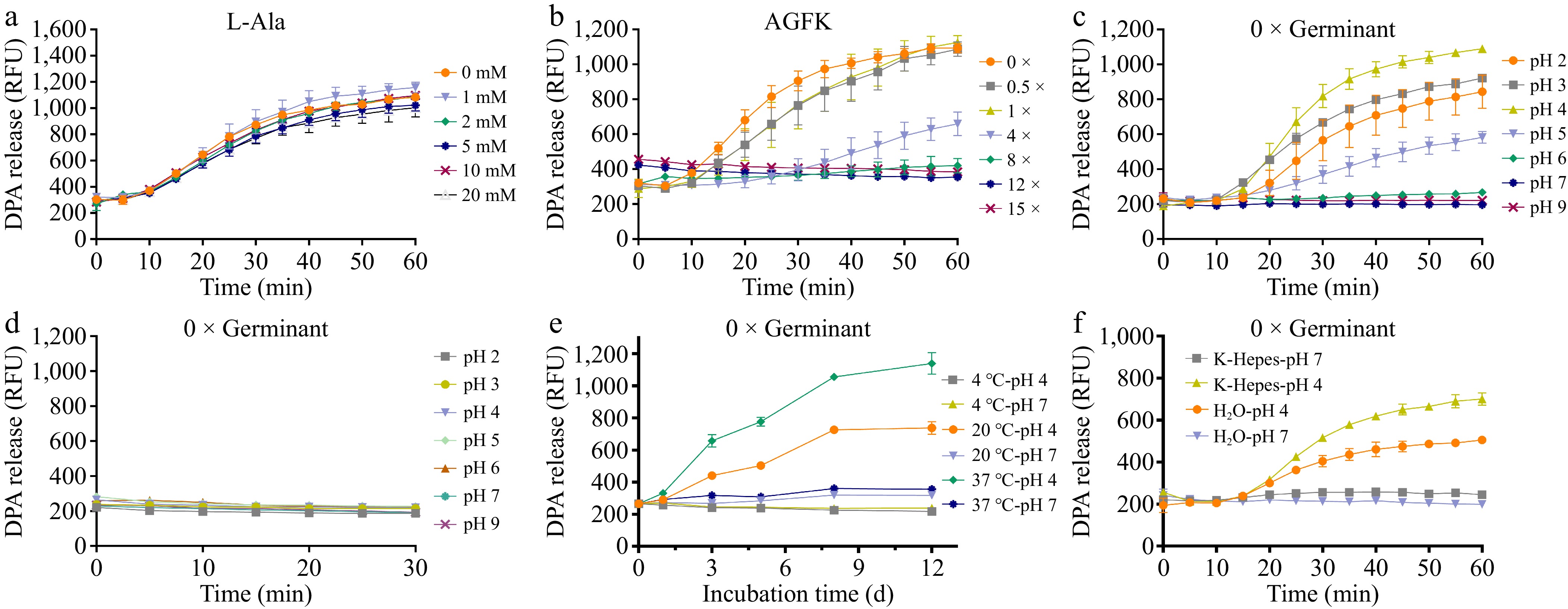 Germination of A. acidoterrestris spores under varying nutrient germinant concentrations and pH conditions. DPA release from heat-activated spores induced by different concentrations of (a) L-alanine, and (b) AGFK in pH 4 K-Hepes; DPA release from (c) heat-activated spores, and (d) non-heat-activated spores under pH 2–9 conditions in the absence of nutrient germinants; (e) DPA release of spores incubated in pH 4 and 7 systems at 4, 20, and 37 °C for 1, 3, 5, 8, and 12 d. (f) DPA release from spores was monitored in germinant-free sterile water and K-Hepes buffers at pH 4 and 7. Each experiment in the figure included three replicate groups.
