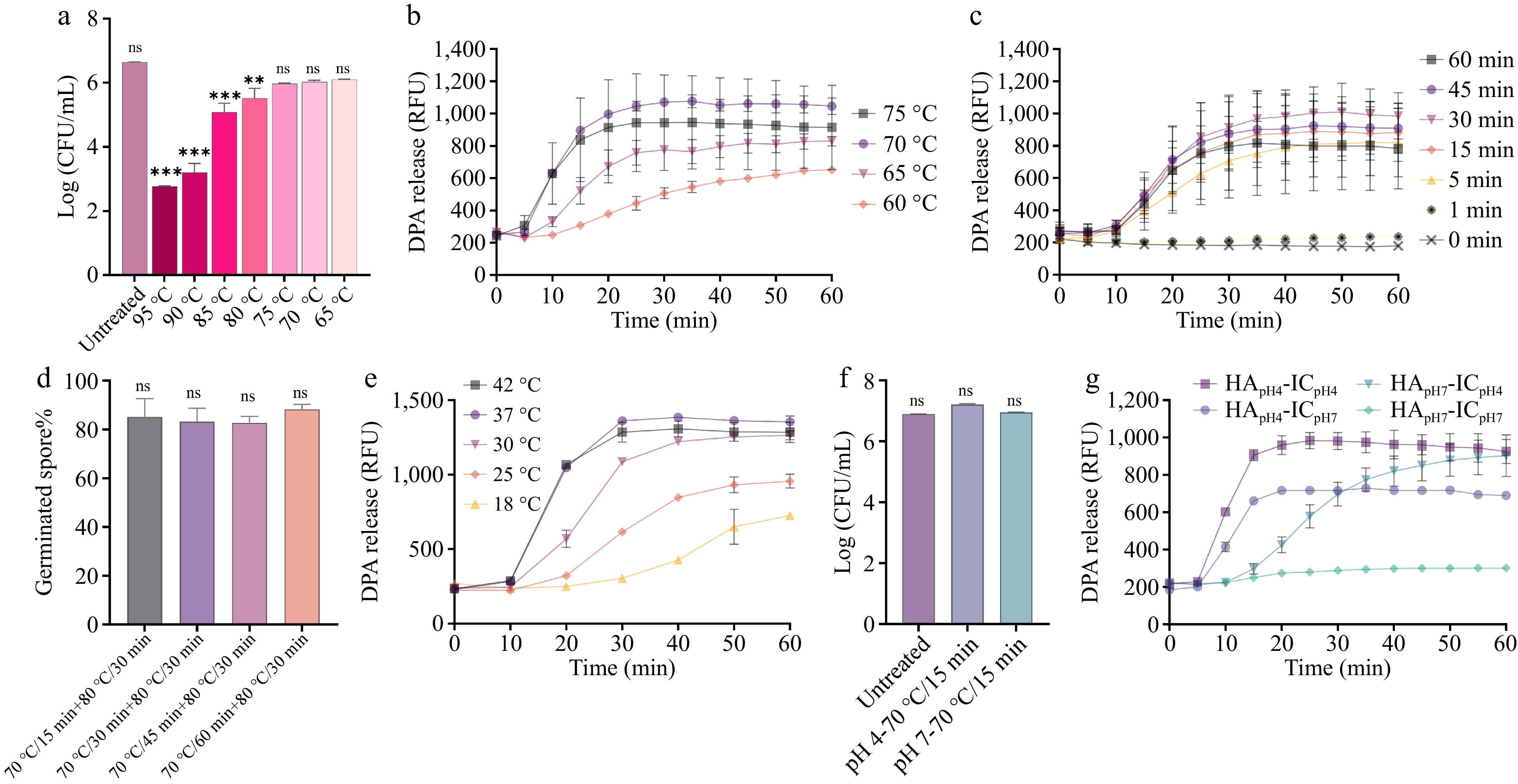 Optimization of heat activation conditions for A. acidoterrestris spore germination. (a) Heat resistance of A. acidoterrestris spores at 95, 90, 85, 80, 75, 70, and 65  °C for 60 min; (b) DPA release from spores after heat activation at 75, 70, 65, and 60  °C for 30 min in pH 4; (c) heat activation at 70 °C for 1, 5, 15, 30, 45, and 60 min; (d) spores were heat activated at 70 °C for 15, 30, 45, or 60 min, then divided into two groups: one was directly plated for colony enumeration, and the other underwent an additional 80 °C/30 min treatment prior to plating. Percentage of germinated spores was calculated as: (CFU after heat activation-CFU after 80 °C treatment)/CFU after heat activation × 100%; (e) DPA release from spores heat-activated at 70 °C for 15 min and incubated at 18, 25, 30, 37, and 42 °C; (f) viable counts of untreated spores and spores heat activated at 70 °C for 15 min in pH 4 and 7; (g) DPA release from spores heat activated at pH 4 or 7, then immediately incubated (IC) at 37 °C and pH 4 or 7. Each experiment in the figure included three replicate groups.