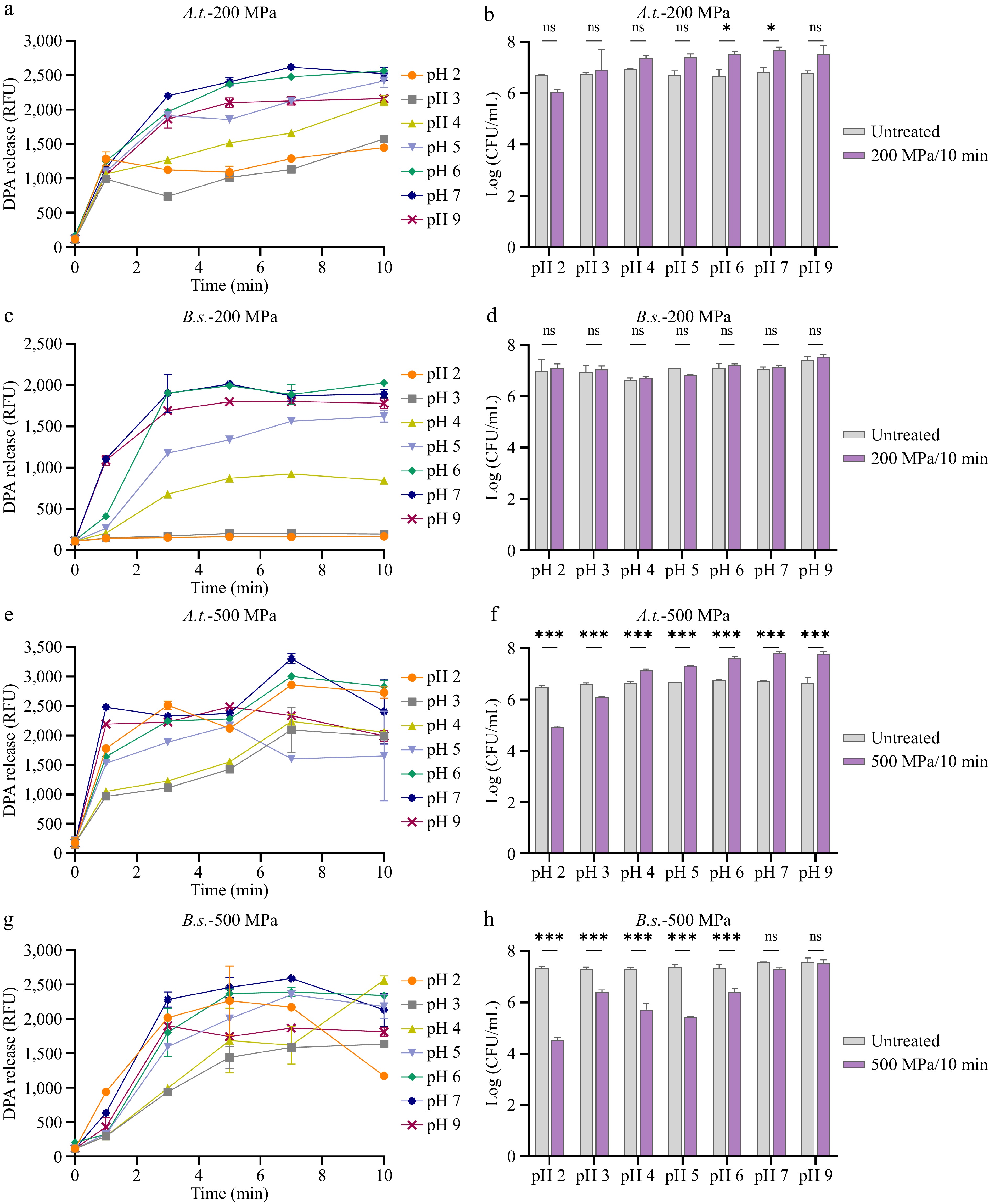 • The germination of bacterial spores induced by HHP is well-established, with pH recognized as a critical factor regulating germination efficiency[41]. The germination response of A. acidoterrestris spores to HHP treatment across a range of pH conditions were characterized. A. acidoterrestris and B. subtilis spores were treated at 30 °C, 200 or 500 MPa HHP for 1–10 min. The release of DPA was measured to examine germination, while the number of surviving spores was determined to examine their viability after 10 min of HHP treatment. As shown in Fig. 4a, A. acidoterrestris spores treated at 200 MPa exhibited substantial DPA release within the pH range of 5–7, whereas the DPA release was reduced under pH 2–4 conditions. Notably, spore viability remained consistent across pH 3–9 (Fig. 4b), confirming that DPA release resulted from germination rather than loss of viability. A similar pH-dependent germination profile was observed for B. subtilis spores, with pronounced DPA release occurring between pH 5 and 7 and stronger suppression at pH 2–4 compared with A. acidoterrestris spores (Fig. 4c). Consistent with this, no significant loss in viability was detected between pH 2 and 9 (Fig. 4d), indicating that the HHP treatment at 200 MPa did not cause spore inactivation. Together, these data demonstrate that at 200 MPa, both A. acidoterrestris and B. subtilis spores exhibited optimal germination rates and ratios within pH 5–7, whereas A. acidoterrestris spores remained capable of germinating under acidic conditions (pH 2–5), confirming their acidophilic nature. At 500 MPa, A. acidoterrestris spores showed elevated germination rates and ratios at pH 6–9, whereas germination was considerably slower between pH 3 and 5 (Fig. 4e). The concomitant decrease in viable counts at pH 2–3 (Fig. 4f) suggests that part of the DPA release under these conditions may be attributable to spore rupture or inactivation. In contrast, B. subtilis spores displayed substantial DPA release across pH 2–9 under 500 MPa (Fig. 4g). However, a sharp decline in viability was observed from pH 2 to 6 (Fig. 4h), implying that the synergistic interaction of high pressure and acidic pH increases spore sensitivity, ultimately leading to death-associated DPA release. Taken together, A. acidoterrestris spores can also exhibited extensive germination efficiency under acidic pH following exposure to 500 MPa.