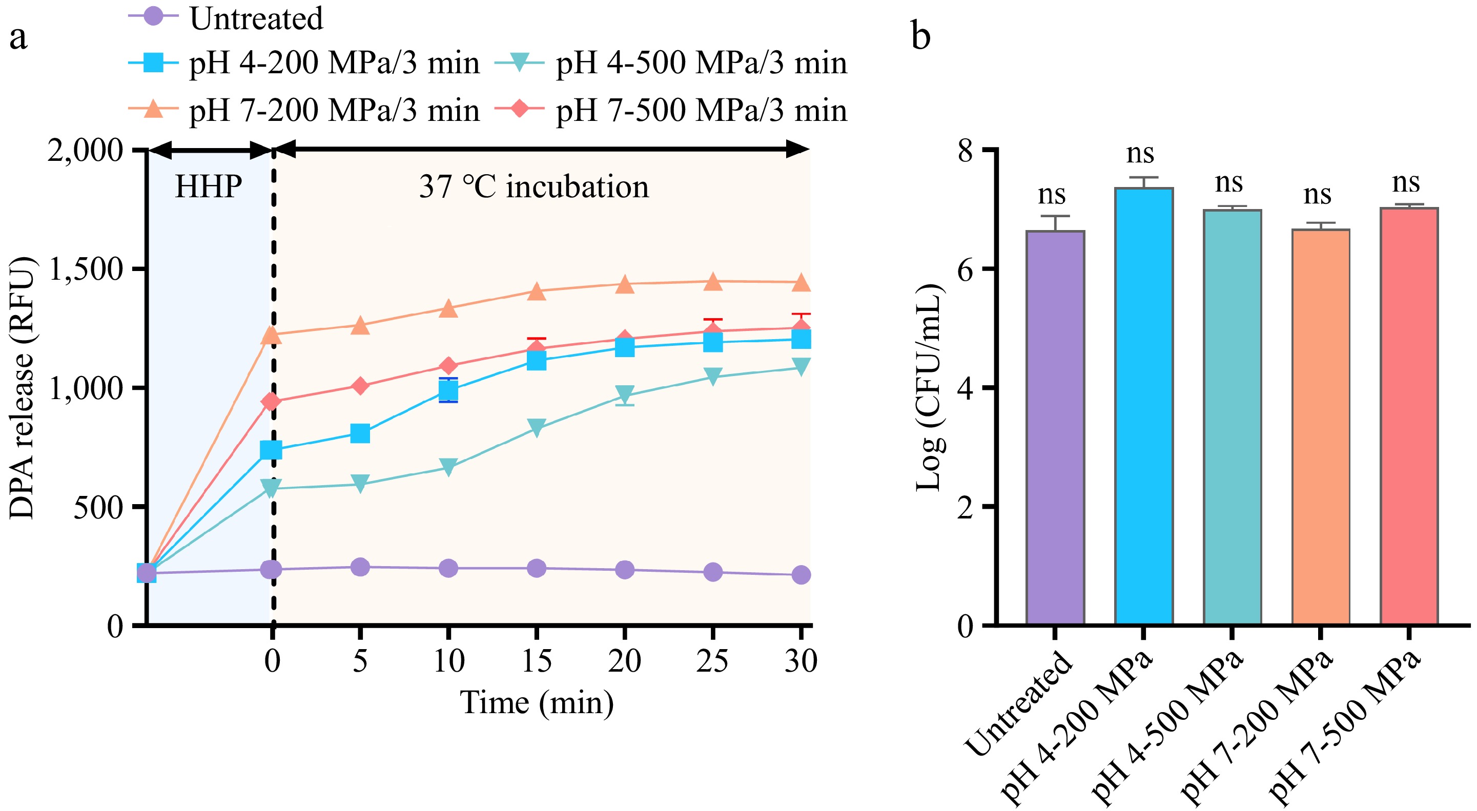Spontaneous germination and viability of A. acidoterrestris spores under acidic and neutral conditions. (a) After HHP (200 or 500 MPa/3 min/30 °C) , DPA release in the supernatant was measured immediately, the pellet was subsequently incubated at 37 °C to monitor DPA release over a 30 min period. (b) Colony counts of spores at pH 4 and 7 immediately after the HHP treatment. Each experiment in the figure included three replicate groups.