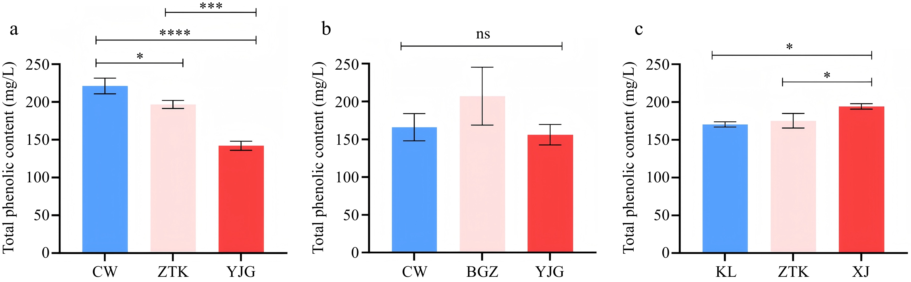 As shown in Fig. 2a, the total phenolic content of Chardonnay from CW reached the highest value of 221.10 ± 10.42 mg/L after fermentation, which was significantly higher than that of Chardonnay from ZTK and YJG. As shown in Fig. 2b, there were no significant differences among the three Italian Riesling wines. Figure 2c shows that the total phenolic content of Petit Manseng from XJ was relatively high, reaching 194.20 ± 3.68 mg/L, and there were significant differences in the total phenolic content of Petit Manseng from KL and ZTK. The results indicated that different production areas lead to differences in the total phenolic content of different varieties of dry white wine.