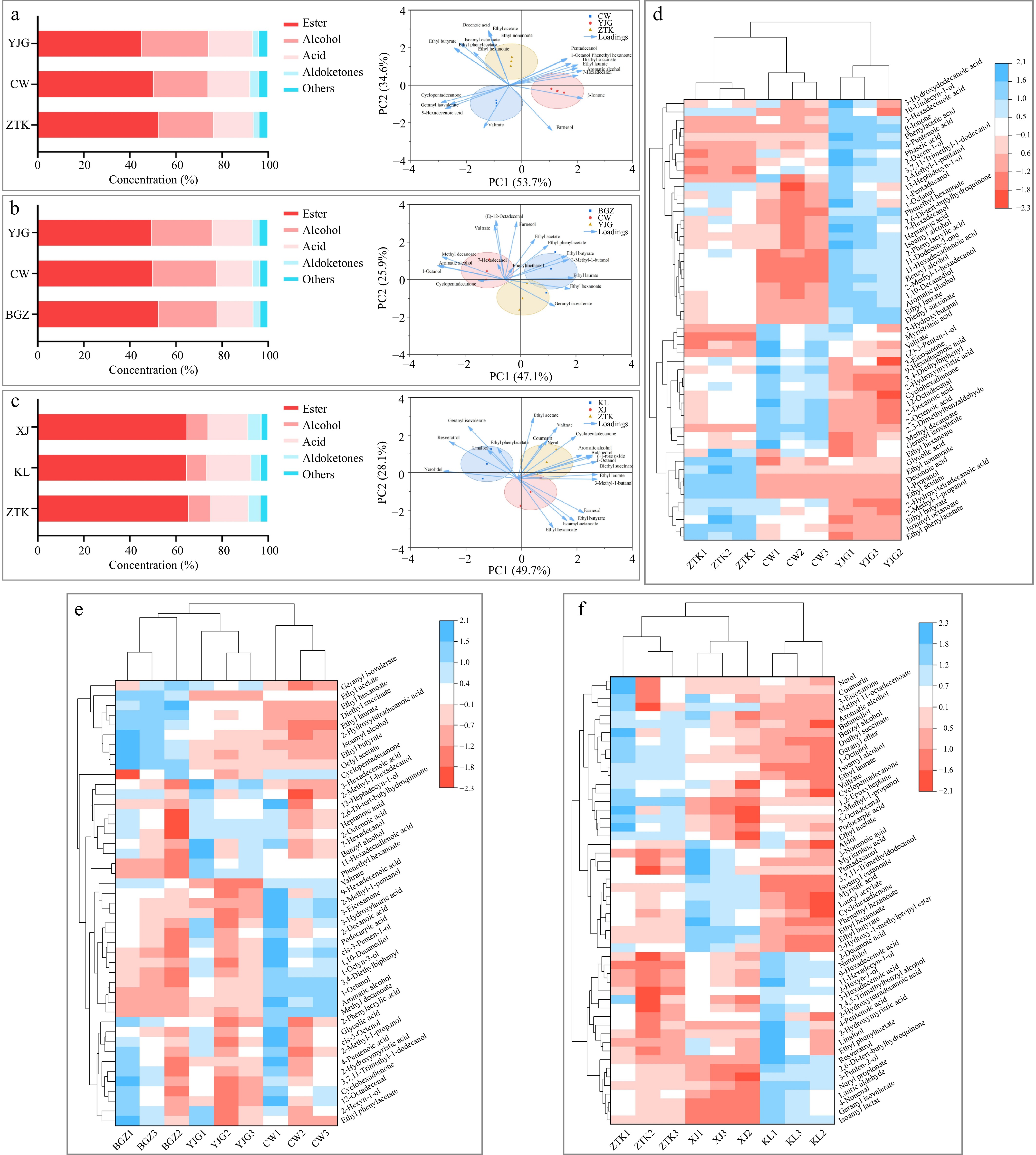From Fig. 3ac, we can see that the composition of aroma components in wines from different small production areas has certain similarities. Ester substances are the main components of aroma, followed by alcohol and acid. Esters are the main source of fruit and floral flavors in wines. Among the three grape varieties, Petit Manseng had the highest proportion of ester compounds and the lowest content of alcohol compounds, indicating that its fruity and floral aromas were more prominent. In the Chardonnay and Italian Riesling wines, those from ZTK and BGZ exhibited the highest levels of ester compounds.