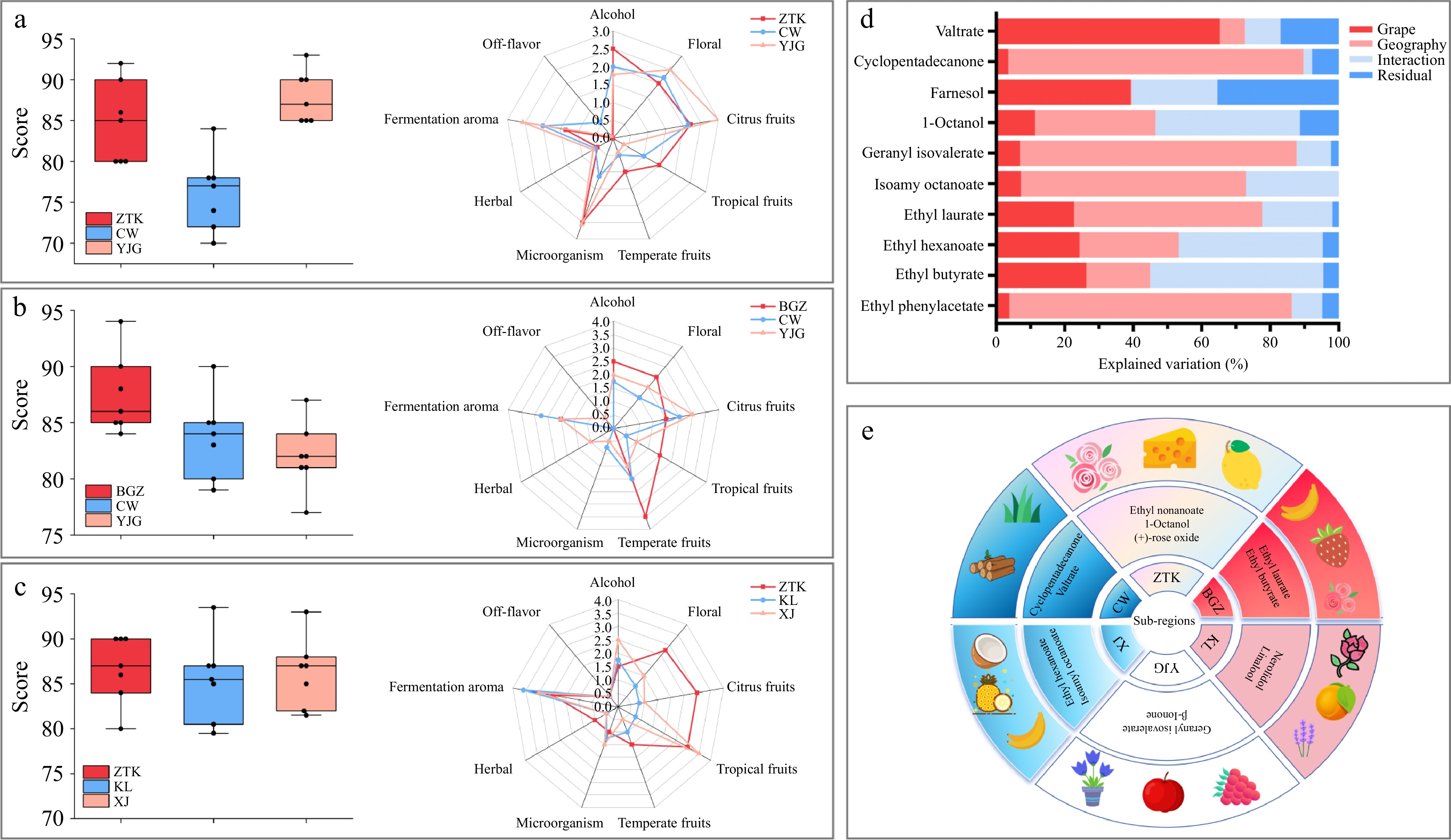 A two-way ANOVA was performed on the compounds present in all three grape varieties[37] with high OAV values to investigate how strain and geographical location influence these compounds (Fig. 4d). The results demonstrated that ethyl butyrate, farnesol, and valtrate were more significantly affected by grape variety, whereas ethyl phenylacetate, ethyl hexanoate, ethyl laurate, isoamyl octanoate, geranyl isovalerate, 1-octanol, and cyclopentadecanone showed greater dependence on the geographical location. Aroma compounds for which the variation explained by geographical factors exceeded that of grape variety, along with those exhibiting significantly higher concentrations in specific subregions, were identified as representative aroma markers for those subregions (Fig 4e). It can be observed that geographically adjacent subregions exhibited similarities in their representative aroma profiles. For instance, ZTK and BGZ, being located in close proximity, shared a distinctive rose-like floral character. Similarly, KL and YJG, which are also geographically close, were characterized by notes of acidic fruits and purple flowers. Wines from the XJ subregion displayed a pronounced tropical fruit aroma, whereas those from CW were marked by distinct woody and grassy notes. The fact that each subregion possesses a distinguishable aromatic fingerprint provides critical guidance for viticultural planning in different subregions of Yantai. This finding offers a scientific basis for addressing the issue of wine homogenization in the Yantai region.