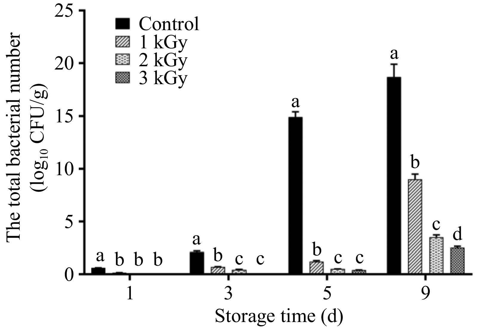 Microbial contamination is a significant challenge in the storage of fresh-cut vegetables. Minimal processing operations such as cutting and dicing, critically determine initial microbial load and the subsequent pattern of microbial growth[13]. Contamination by human, animal, or environmental pathogens can occur during primary production and processing[14], with fresh-cut produce known to harbor pathogens such as Escherichia coli O157:H7, Salmonella enterica, and Listeria monocytogenes[13,15]. Different produce items vary in their ability to support bacterial growth. For example, in fresh-cut lettuce, storage for just 3 d led to a substantial increase in total colony count (exceeding 5 log10 CFU/g), notably from Pseudomonas, resulting in significant sensory quality deterioration[16]. Similarly, in fresh-cut lotus root, the cutting process disrupts the tissue, creating an environment conducive to microbial proliferation. As shown in Fig. 1, total viable counts in untreated (control) lotus root increased rapidly, reaching 15.2 log10 CFU/g by day 5. In sharp contrast, irradiation significantly (p < 0.05) suppressed growth at this critical stage, with the values of 2.6, 1.1, and 0.8 log10 CFU/g for the 1, 2, and 3 kGy treatments, respectively (Fig. 1). This dose-dependent inhibition persisted throughout storage. On storage day 9, lotus root treated with 1 kGy irradiation reduced the total bacterial number to only half the level of the control group. The total viable counts in the 2, and 3 kGy treatments remained below 5.0 log10 CFU/g, with the 3 kGy treatment demonstrating the strongest antimicrobial efficacy. These results clearly indicate that irradiation is a highly effective bactericidal treatment for controlling microbial populations and enhancing the shelf-life of lotus root slices.